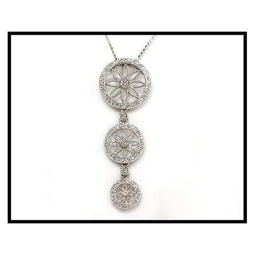 Of the many wonderful pendants we have owned over the years, this is our very favorite. 92 brilliant diamonds are elegant accents to the long design. The largest circle measures 16mm in diameter (5/8"), and the smallest is 10mm in diameter (3/8"). The entire pendant hangs almost 2 inches long. There is no chain. Was priced for $1200. Constructed of 14K solid white gold.