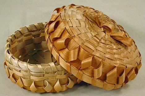 VINTAGE SPLINT ASH AND SWEETGRASS MICMAC INDIAN BASKET W/ LID - Gift or sewing basket. Double row of ash twists on the lid and the sides of the basket w/ sweetgrass accents on the lid.