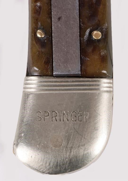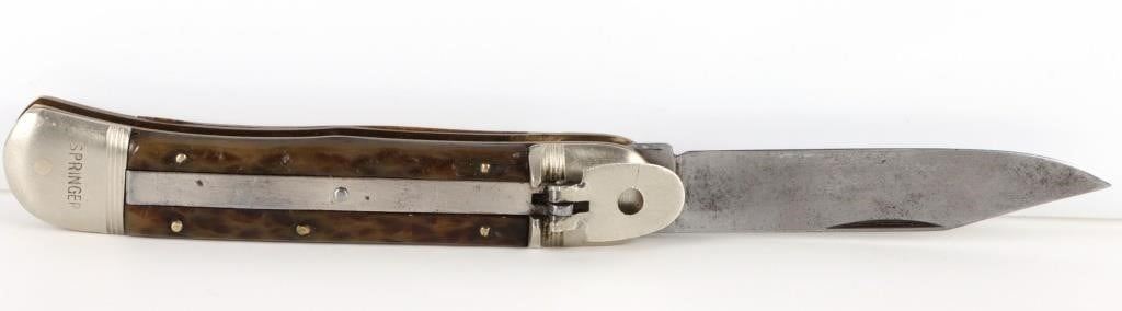 Vintage Springer Carl Hoppe Solingen, Germany Pen pocket knife. Switch mechanism works perfectly on knife. Cutting edge has no chips or glints and is still very sharp. No warp along the edge of the blade.
