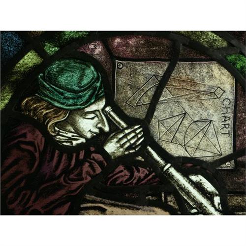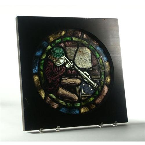 STAINED GLASS: Framed stained glass panel depicting male astronomer with constellation symbology background, 22.25'' x 22.25'' x 1.75'', diameter of panel is 17.5'', 20th c.