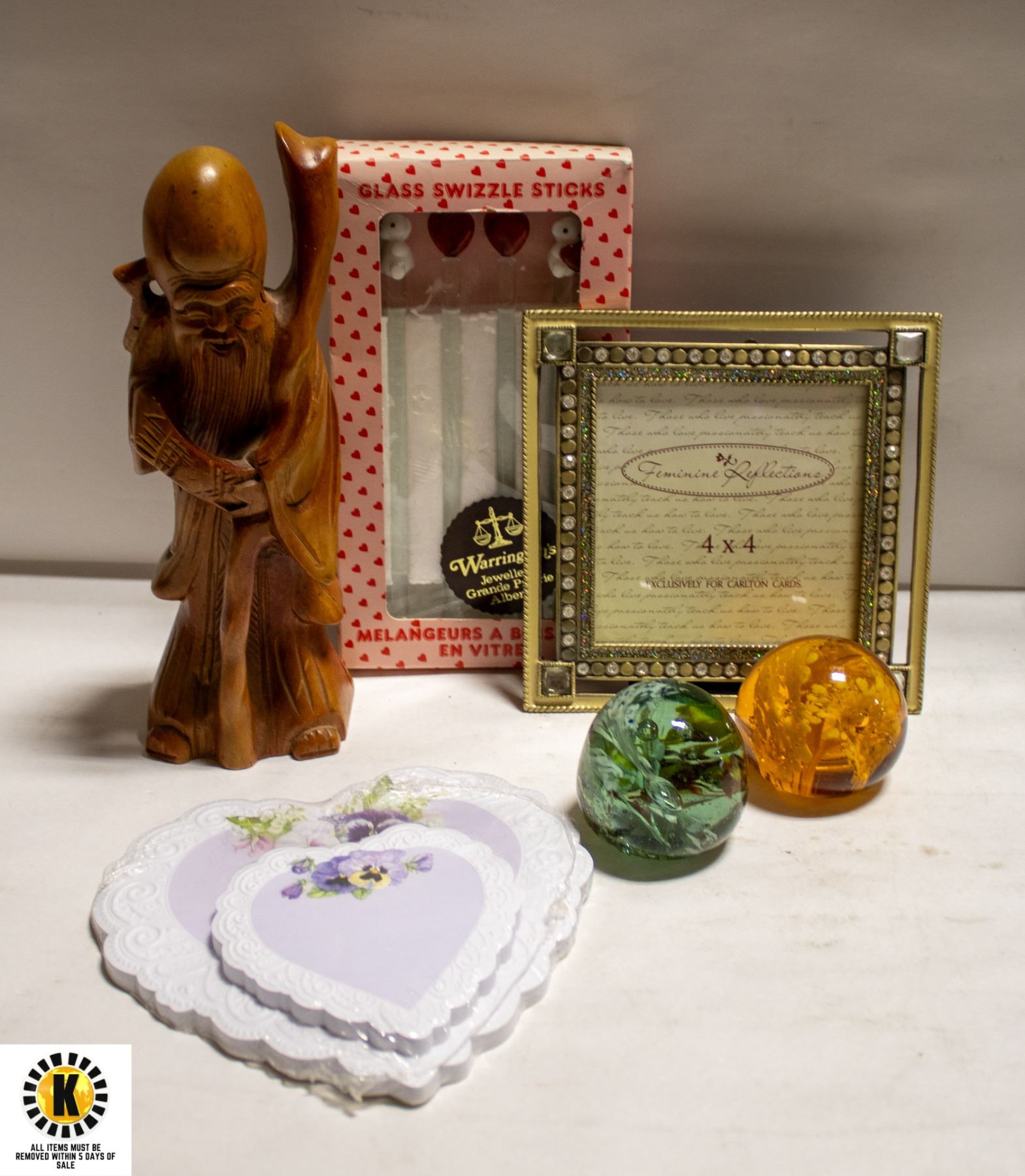 FIGURE, HEART STIR STICKS AND 2 PAPERWEIGHTS (W)