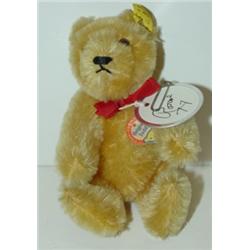 VINTAGE STEIFF JOINTED TEDDY BEAR. Golden color. Marked with label on chest and original tag on left ear. Number on tag on ear is marked 5315. Tag around neck is marked "Roscoe". Excellent condition. 15 cm.