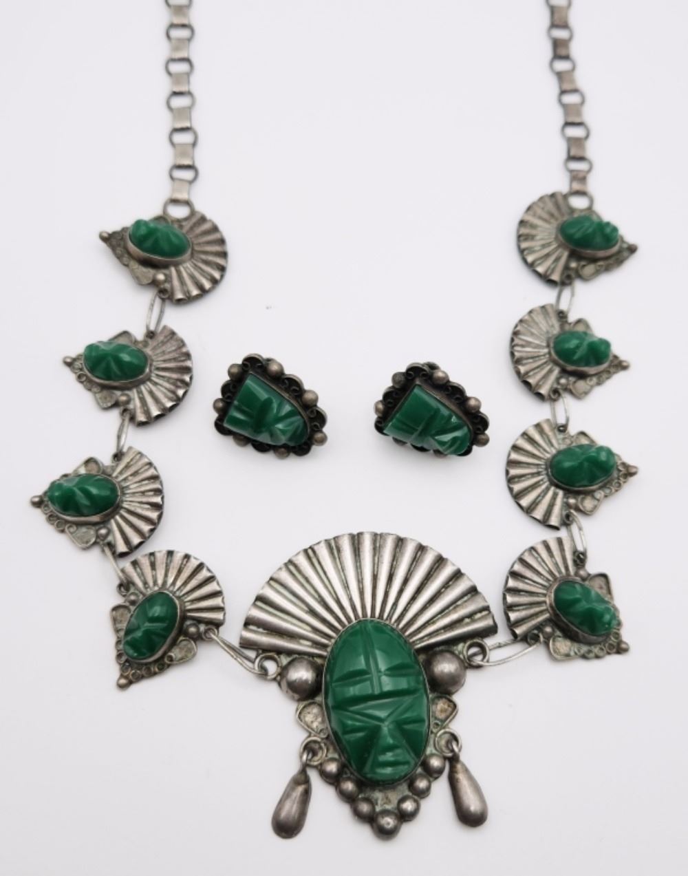 STAMPED PAT. EN. TRAM. MEXICO STERLING - 19" LONG NECKLACE WITH JADE AZTEC - SCREW BACK EARRINGS - TOTAL 42 dwt