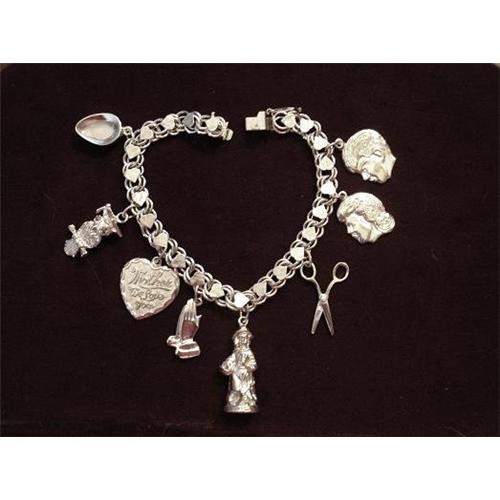 LOVELY VINTAGE LADIES CHARM BRACELET,MADE FROM STERLING SILVER, SIGNED "STERLING, G B",IT MIGHT BE MADE BY BIRKS GOLDSMITHS, HIGHLY DETAILED AND REPRESENTING VARIETY OF 8 CHARMS:DETAILED PROFILE OF A BOY, DETAILED PROFILE OF A GIRL, SCISSORS, FIGURE OF A SAINT?, HANDS IN PRAYER,HEART SHAPED PENDANT "MOTHER WE LOVE YOU", THE CUTEST VERY VISE OWL,AND WHAT IT SEEMS HOSPITAL BEDPAN, THE BRACELET IS EXQUISITE DEPICTING TINY HEARTS ON THE TOP OF CHAIN,PLEASE SEE IMAGES,CLASP IS STRONG WITH SPECIAL LATCH FOR SECURITY, EXCELLENT CONDITION,MEASURING, EXCLUDING CLASPS 7 1/4 inch long, US Buyer to pay 7.00 for shipping plus insurance.THANKS.