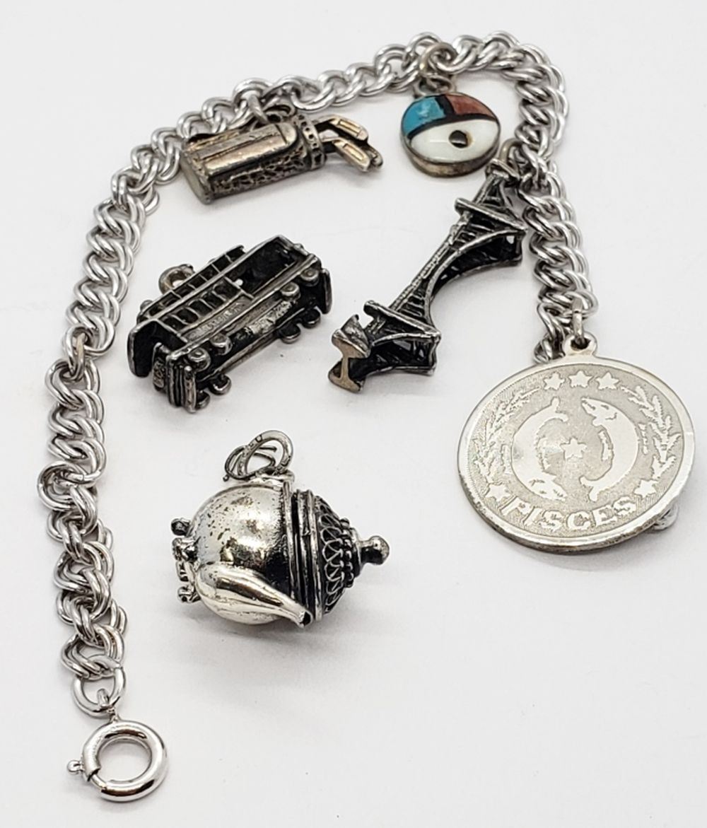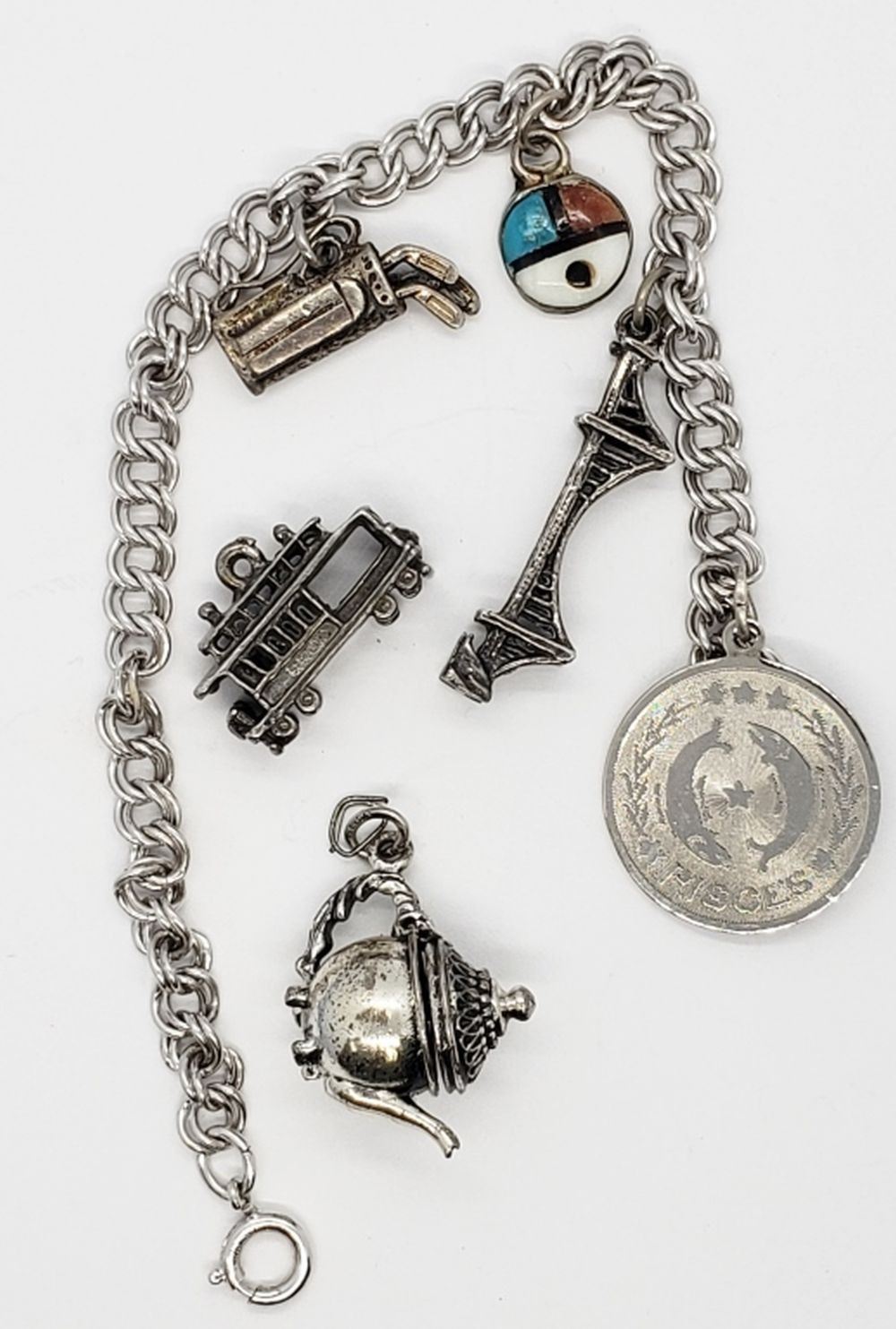 PISCES-GOLDENGATE BRIDGE-ZUNI INLAY-GOLF CLUBS-TEAPOT (OPENS)-TROLLY CAR. TOTAL 15 DWT