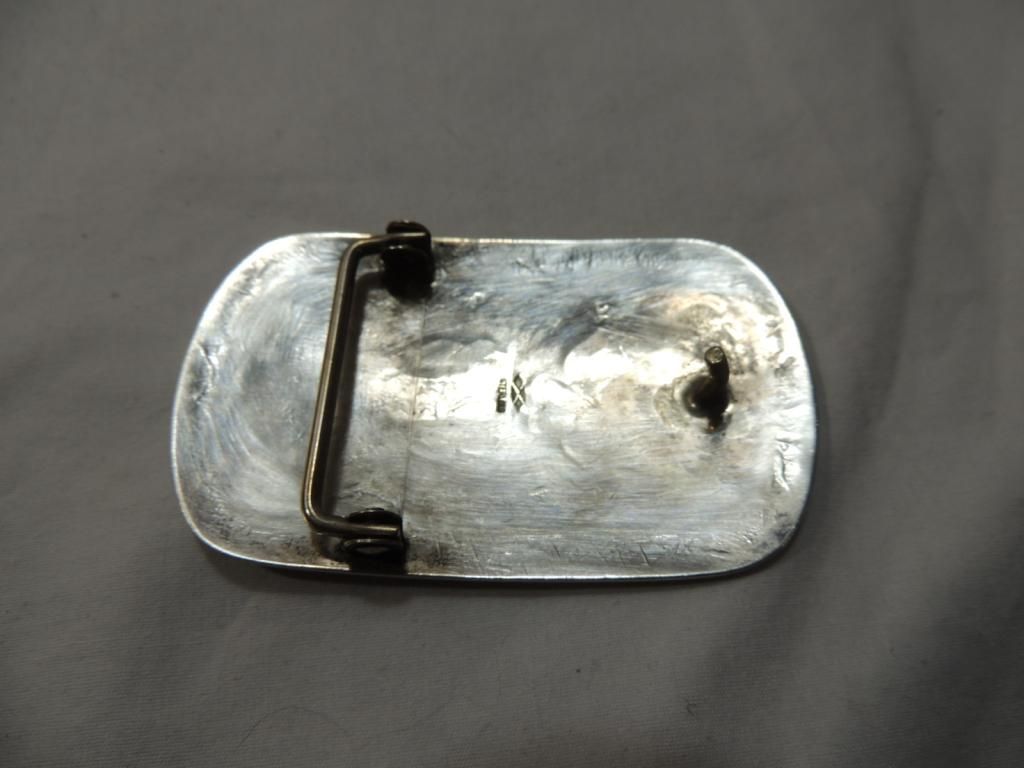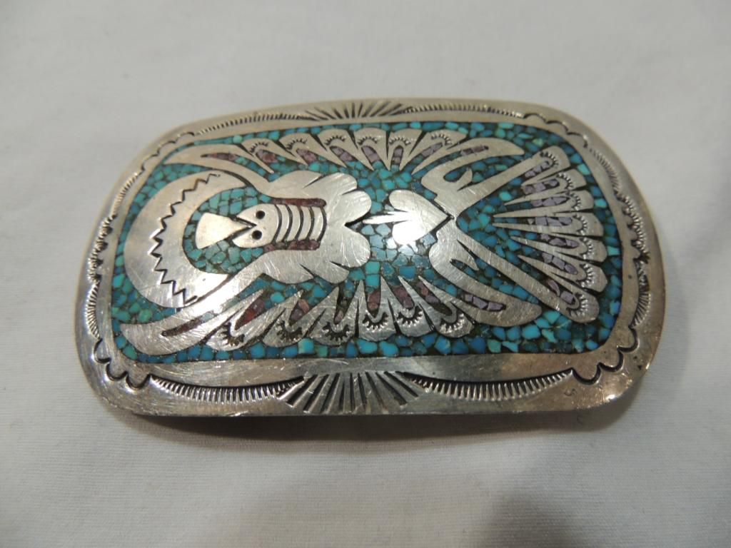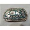 VINTAGE STERLING SILVER & TURQUISE BELT BUCKLE ETCHED DETAILED DESIGN INDIAN ART AZTEK BIRD. AS SHOWN SEE PHOTO FOR MORE DETAILS.