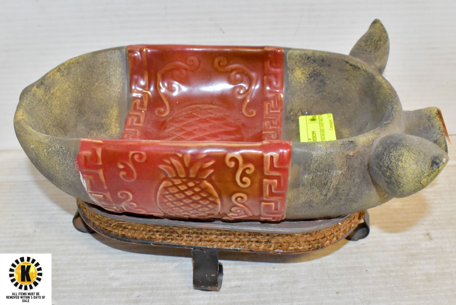 VINTAGE STONEWARE AND METAL PIGGY BOWL