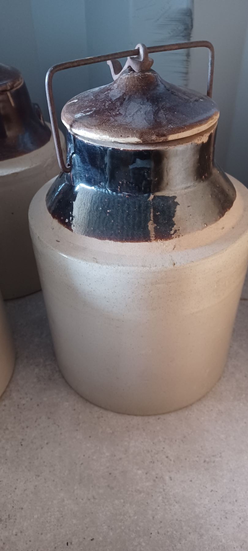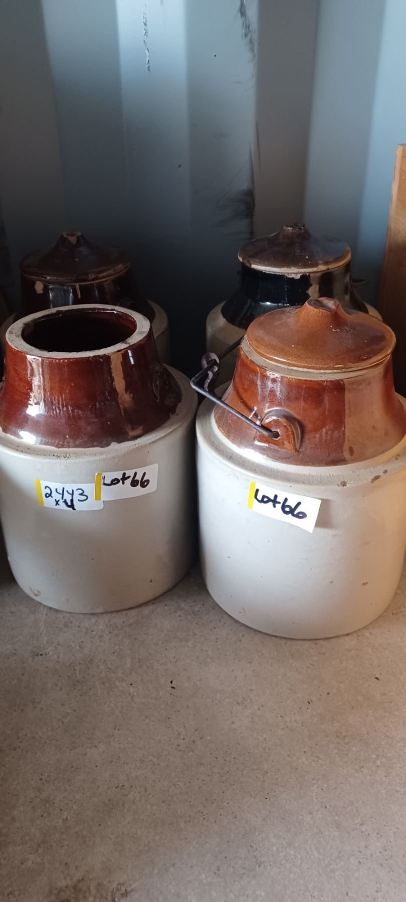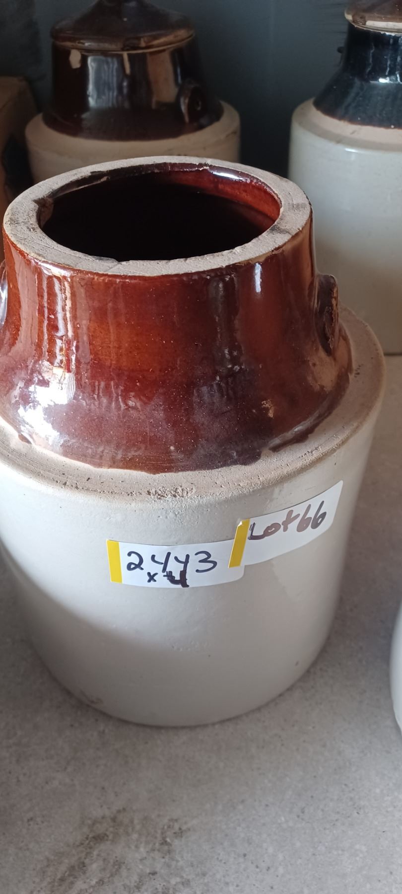 VINTAGE STONEWARE CROCK 2 COMPLETE AND 2 MISSING HANDLES