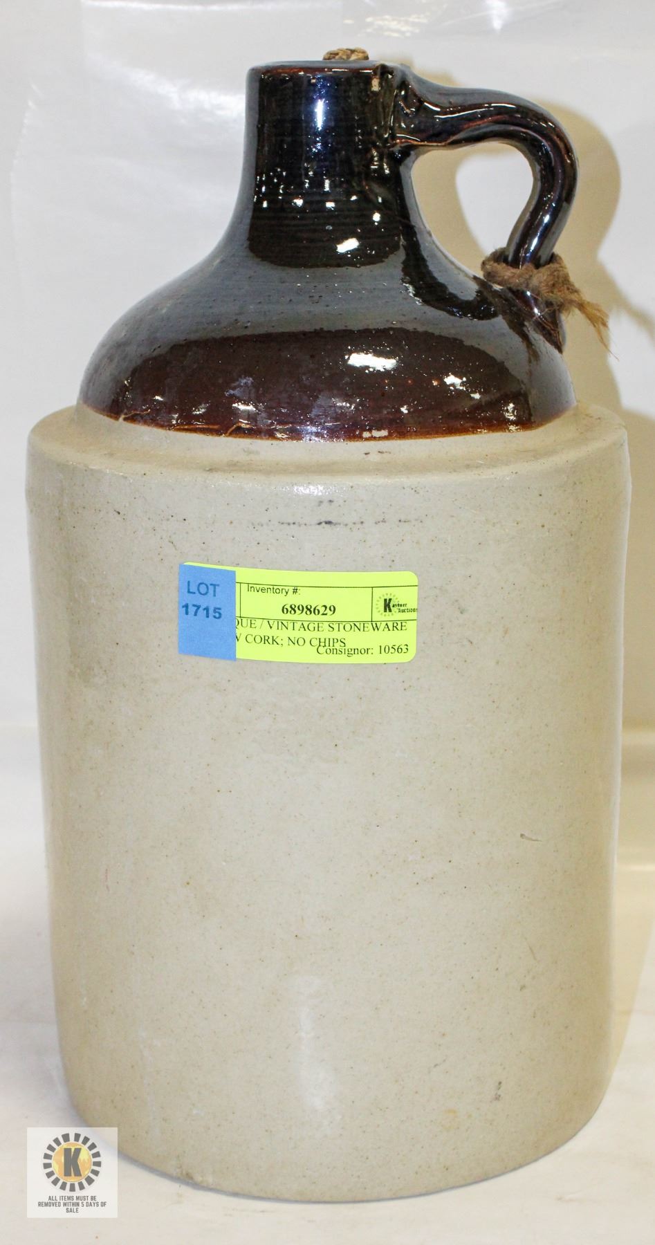 VINTAGE STONEWARE JUG, W/CORK; NO CHIPS
