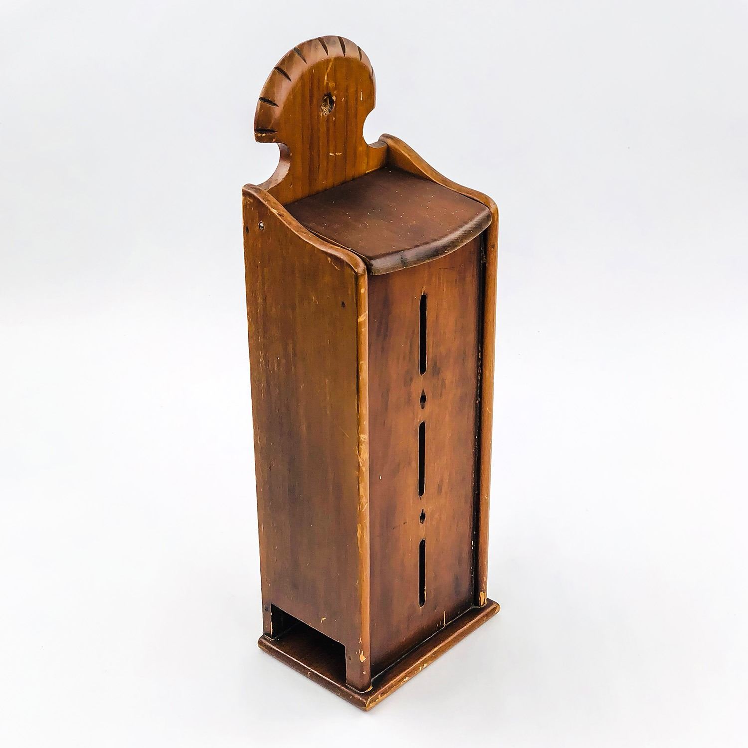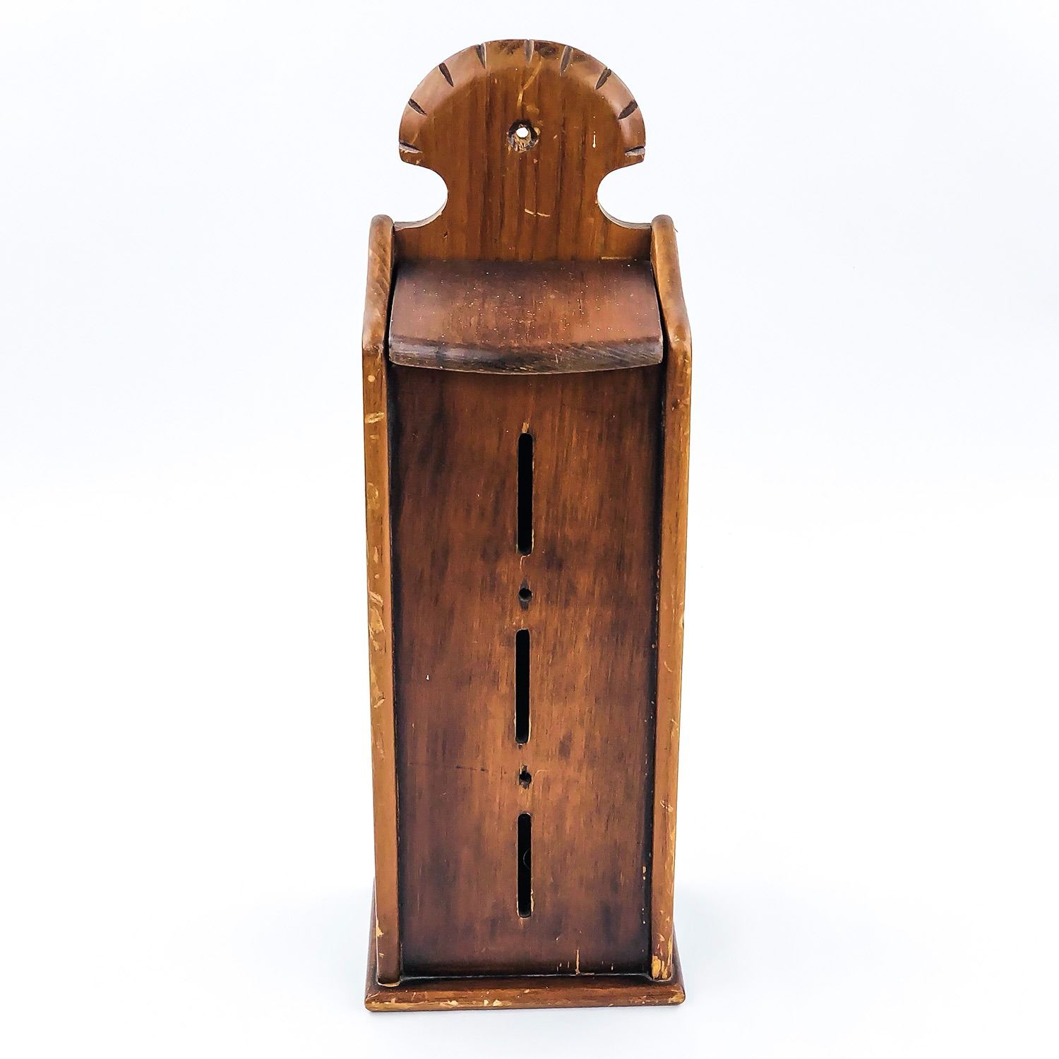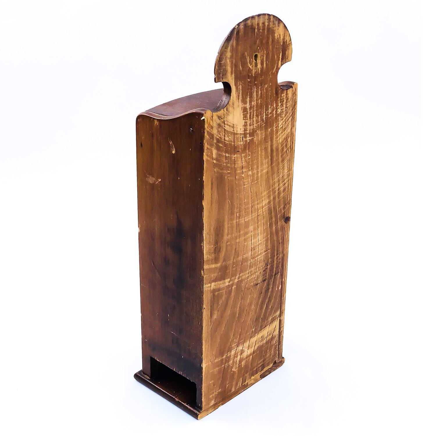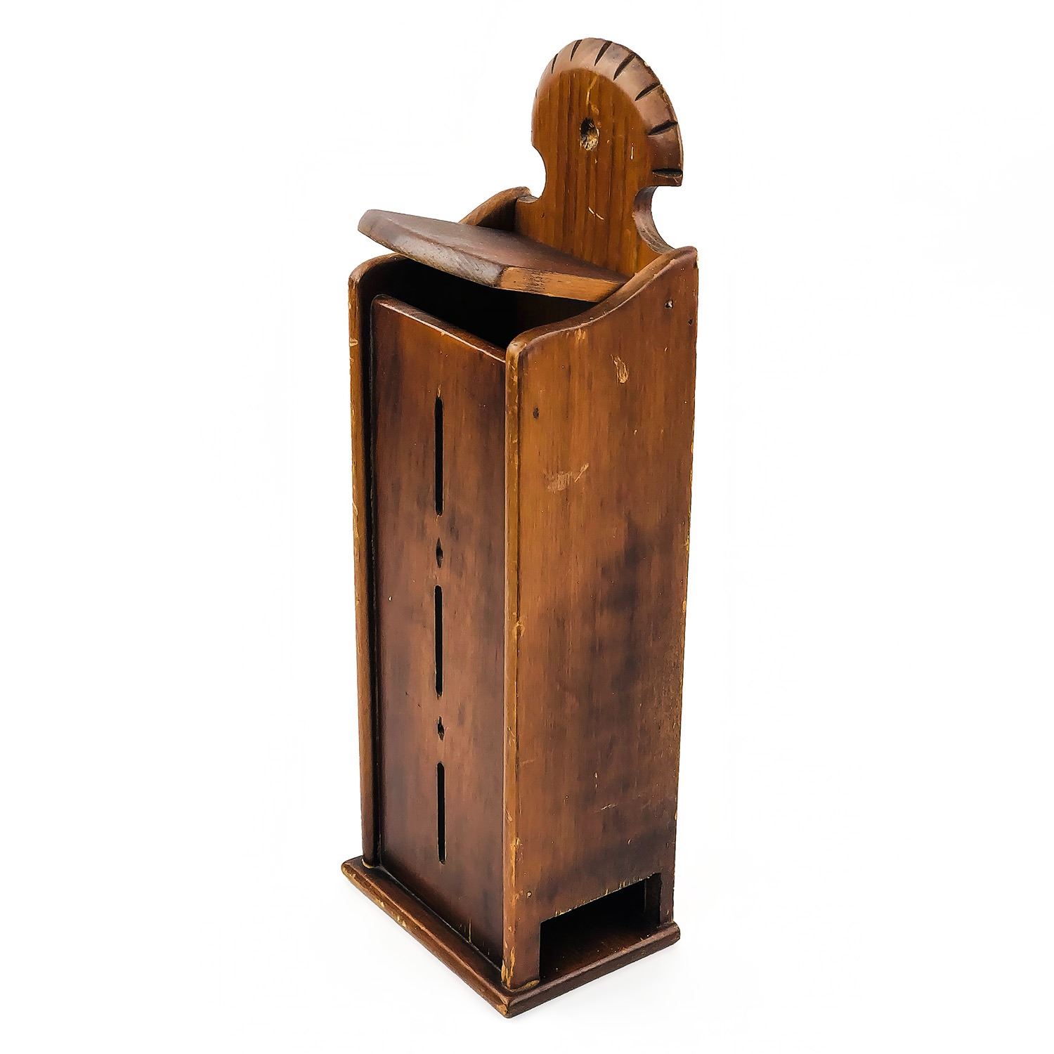 #8356 - WOODEN CIGARETTE PACKAGE WALL DISPENSER WITH FLIP-TOP LID. CIGARETTE PACKS SLIDE OUT THE BOTTOM SIDE HOLES. MEASURES: 13.5” (34 CM) TALL BY 4.25” (11 CM) WIDE AND 3” (8 CM) DEEP