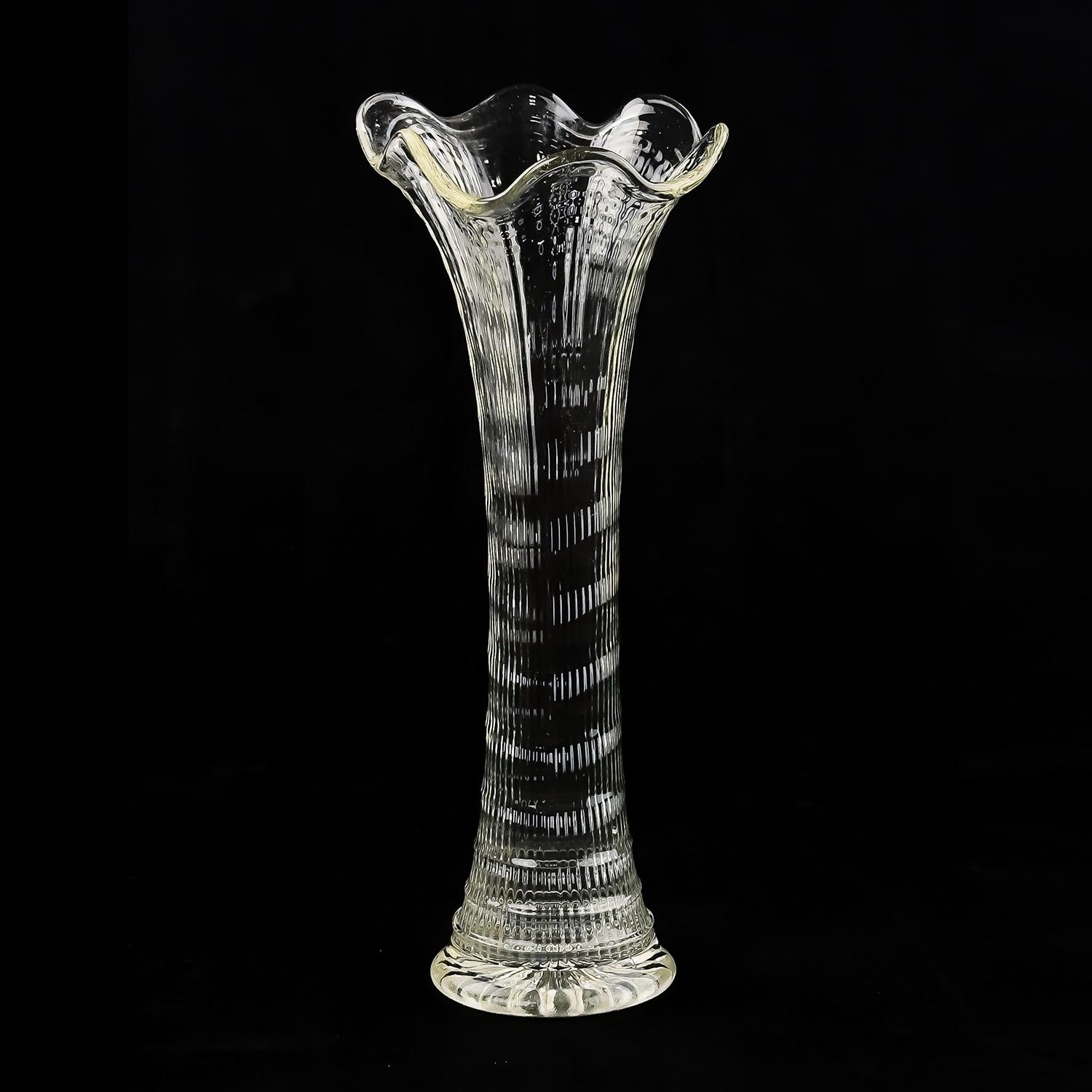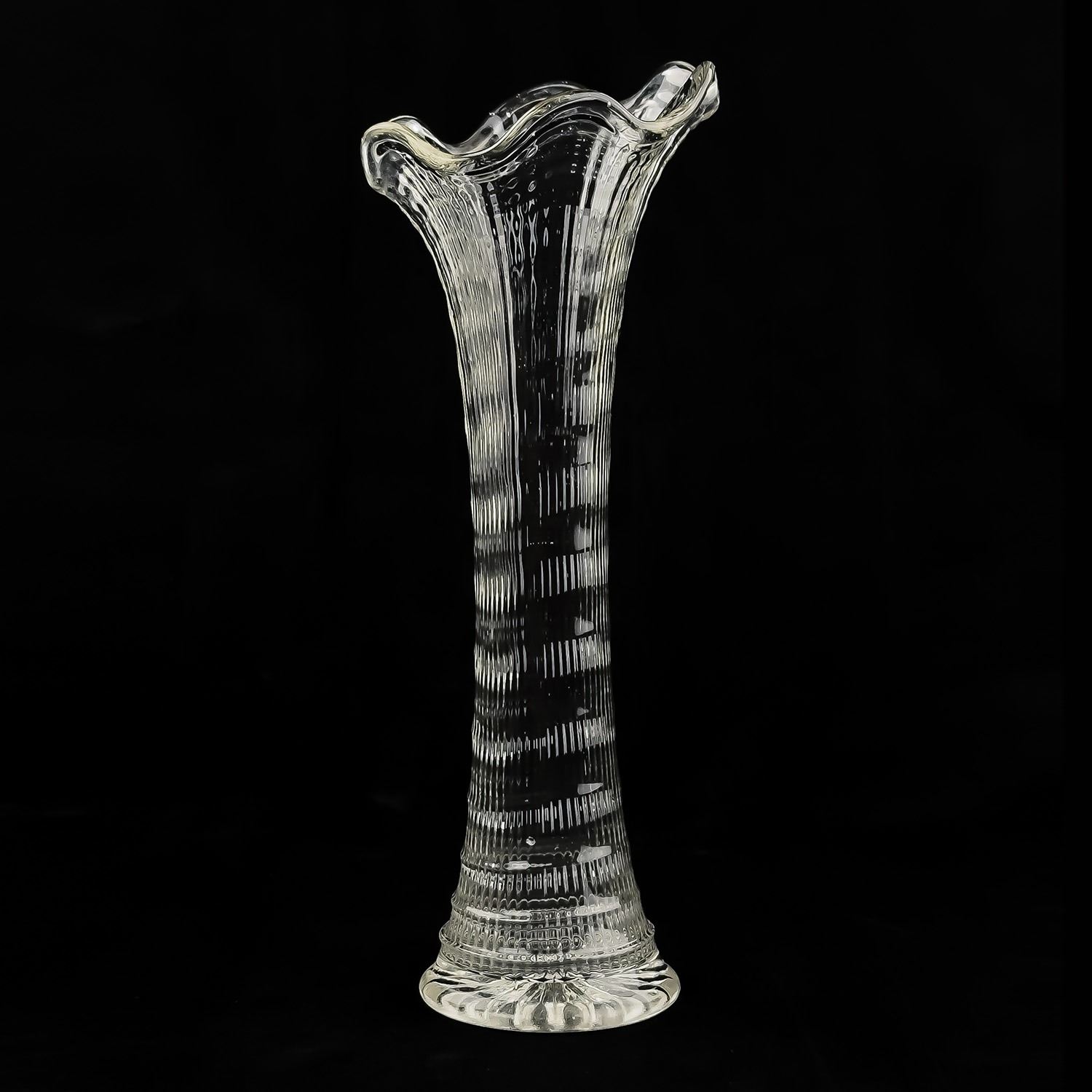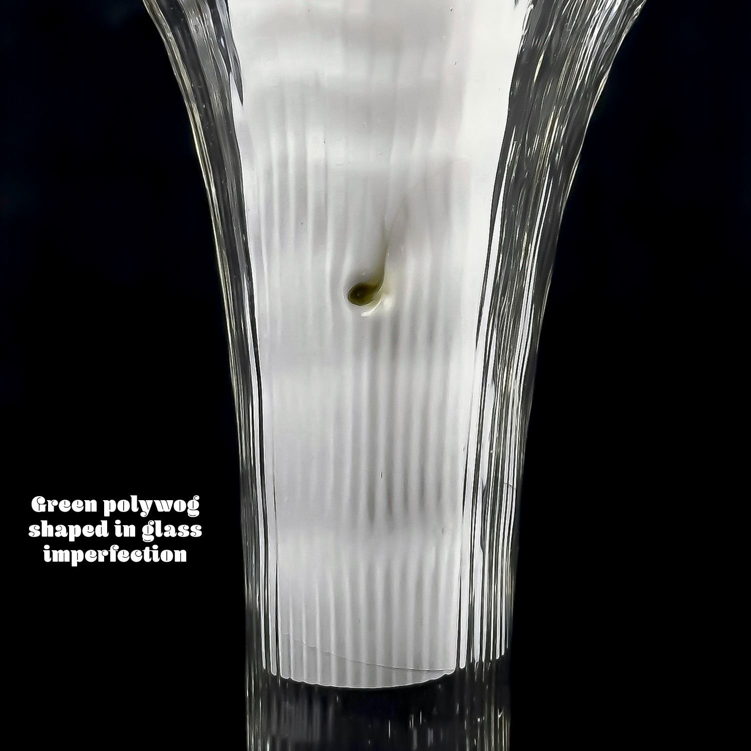 #8025 - VINTAGE CLEAR SWUNG GLASS VASE SCULPTURE. IT HAS SOME SMALL AIR BUBBLES IN THE GLASS AS WELL AS A POLYWOG-LIKE GREEN IMPERFECTION IN THE GLASS FROM WHEN IT WAS CREATED. MEASURES: 10.75” (27 CM) TALL WITH 3” (7.5 CM) DIAMETER BASE AND 4.5” (11.5 CM) FLAIR-TOP OPENING