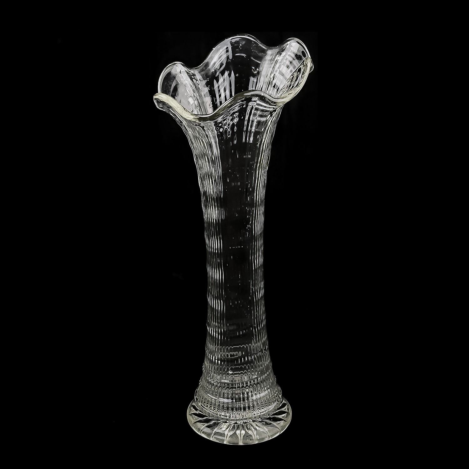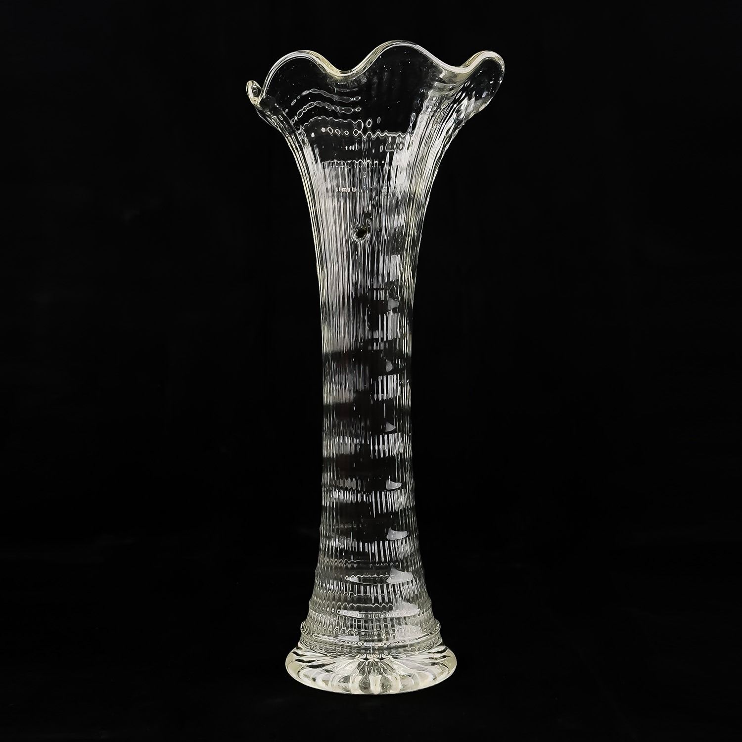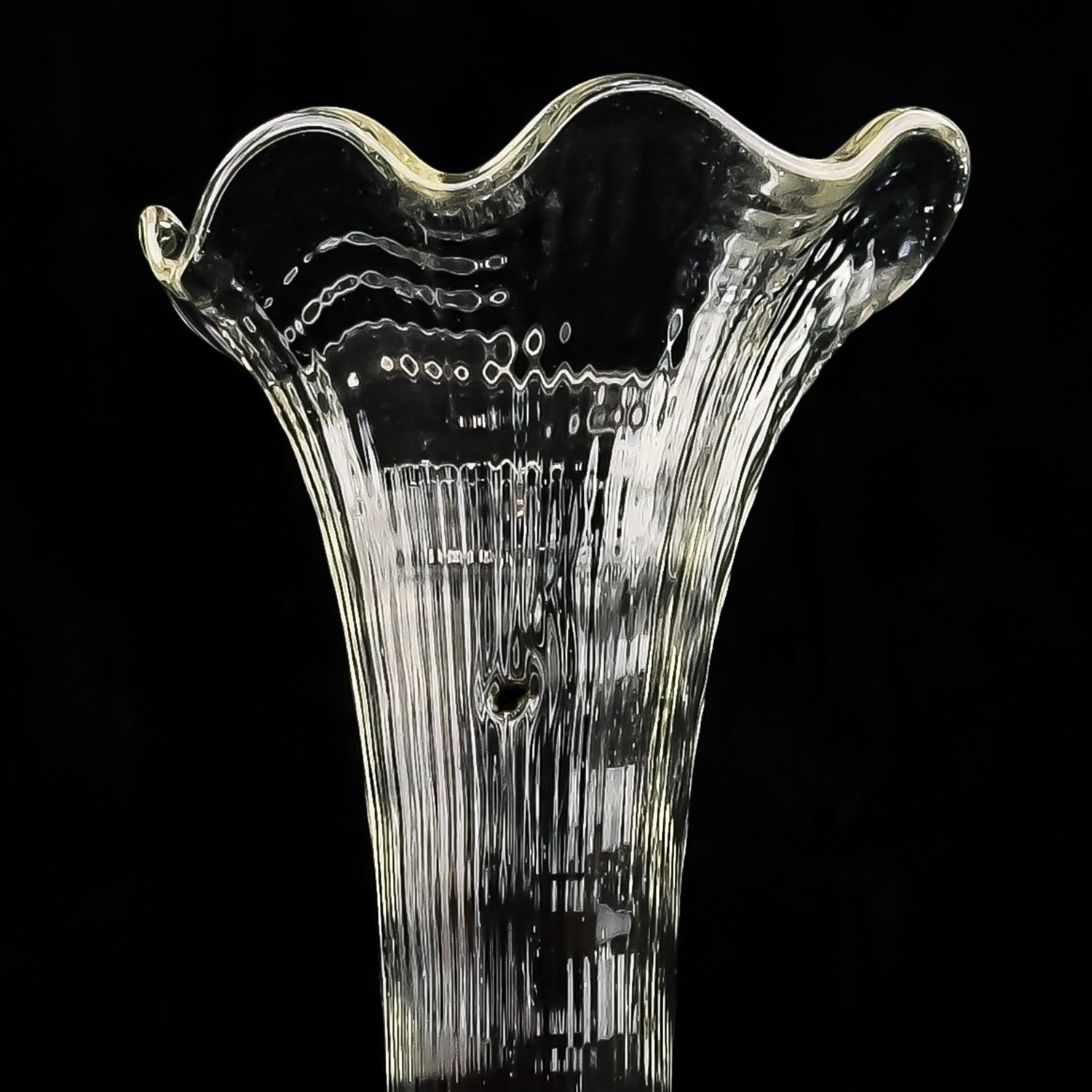 #8025 - VINTAGE CLEAR SWUNG GLASS VASE SCULPTURE. IT HAS SOME SMALL AIR BUBBLES IN THE GLASS AS WELL AS A POLYWOG-LIKE GREEN IMPERFECTION IN THE GLASS FROM WHEN IT WAS CREATED. MEASURES: 10.75” (27 CM) TALL WITH 3” (7.5 CM) DIAMETER BASE AND 4.5” (11.5 CM) FLAIR-TOP OPENING