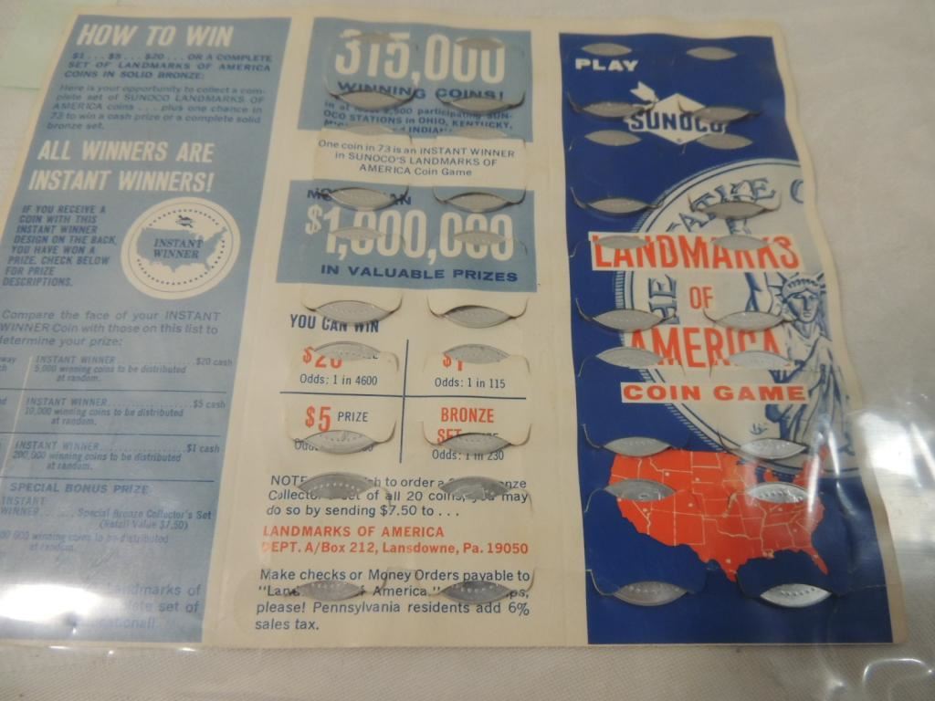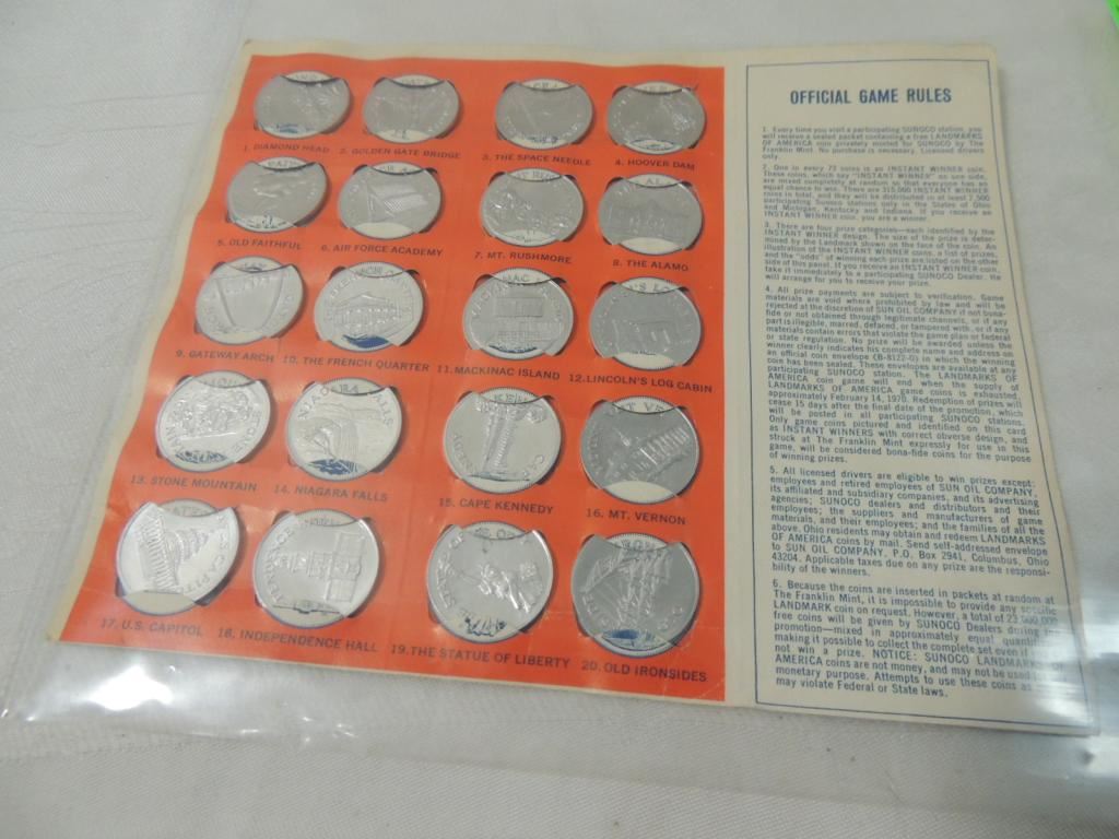 LANDMARKS OF AMERICA COIN GAME, VINTAGE GAME COINS, REWARDS, INSTANT WINNERS, VINTAGE GAS STATION GAME, AS SHOWN SEE PHOTO FOR MORE DETAILS.