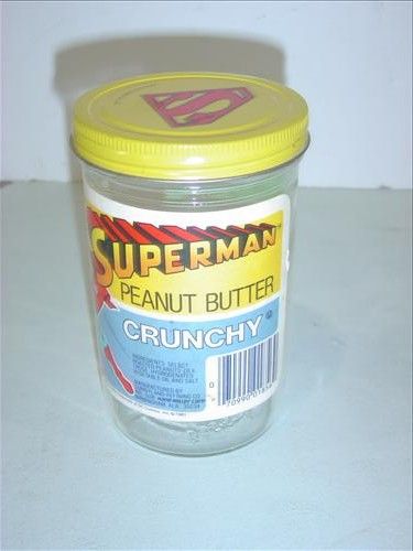 SUPERMAN PEANUT BUTTER JAR. CRUNCHY. MANUFACTURED BY SUNNYLAND REFINING CO. AS SHOWN. VIEW PICTURE FOR DETAIL.