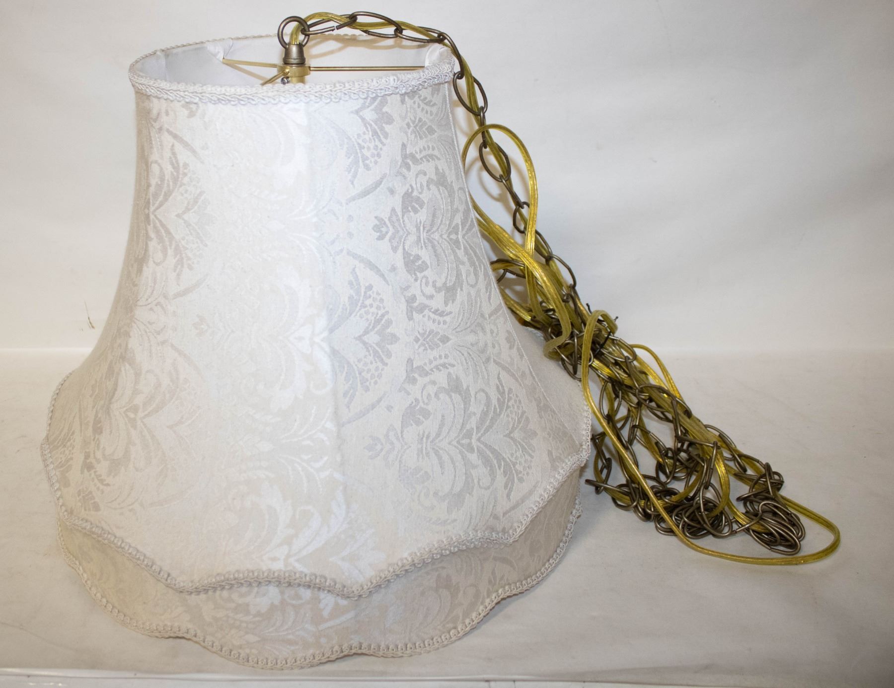 VINTAGE SWAG LAMP W/ FABRIC SHADE - TESTED **ALL ITEMS MUST BE REMOVED BY 5PM SATURDAY, AUGUST 24th 2024. ALL REMAINING ITEMS WILL BE SUBJECT TO A $6.00 PER DAY STORAGE CHARGE. ANY ITEMS REMAINING AFTER MONDAY, SEPTEMBER 16TH 2024 WILL BE CONSIDERED FORFEITED. NO REFUNDS WILL BE ISSUED FOR FORFEITED ITEMS. TO SCHEDULE A PICK UP APPOINTMENT CLICK HERE