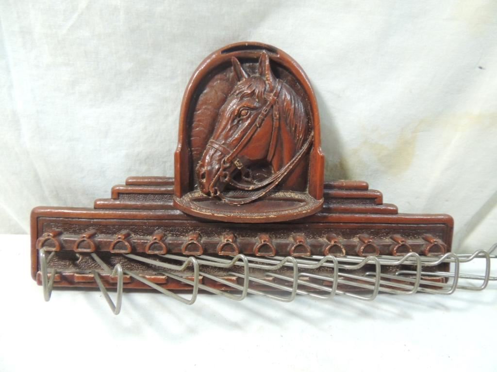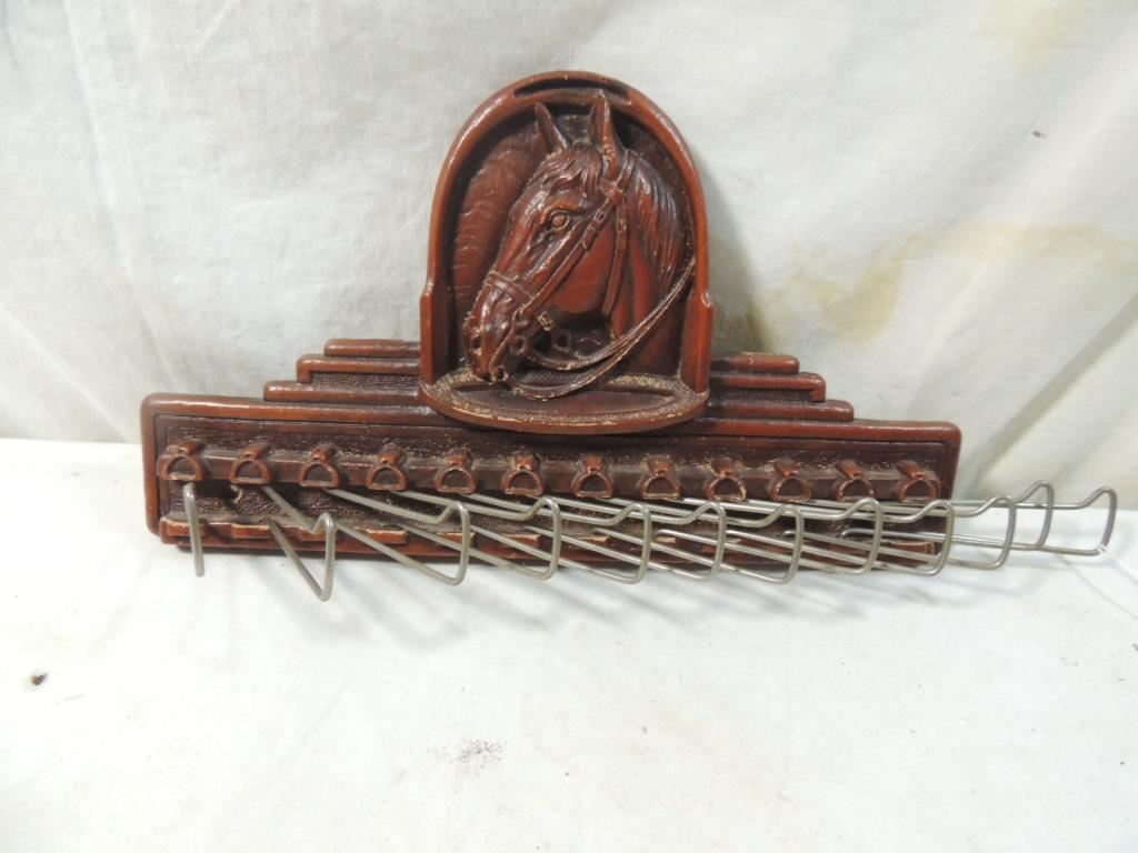 VINTAGE SYROCO WOOD HORSE HEAD TIE HOLDER, WALL MOUNT TIE HOLDER, HORSE HEAD, DECORATIVE VINTAGE AS SHOWN SEE PHOTO FOR MORE DETAILS.