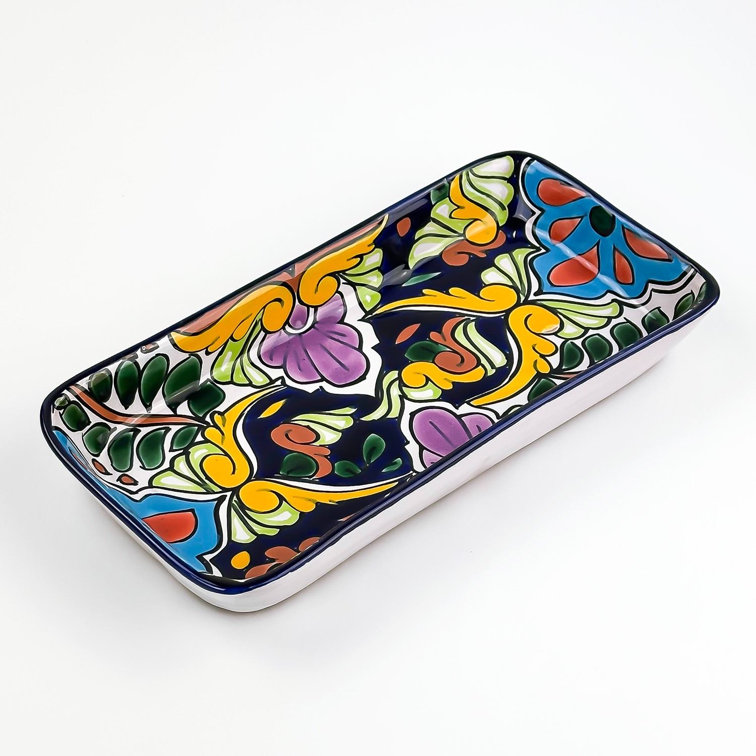 #8077 - SIGNED TALAVERA ART POTTERY DISH OR TRAY. HAND CRAFTED DECORATIVE FLORAL KITCHENWARE. MEASURES: 11” (28 CM) LONG BY 5.25” (13.5 CM) WIDE AND SITS 1.25” (3.125 CM) HIGH