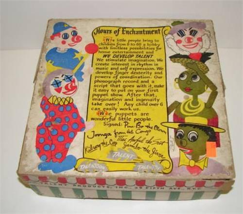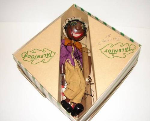 VINTAGE TALENTOON TOY 'JAMBO THE JIVER' MARIONETTE. In original box. Marionette shows some signs of wear. Box shows signs of wear. Manufactured by Talent Products, Inc., 29 Fifth Ave., N.Y.C. Box: 3.75" H, 10.25" W, 10.25" D