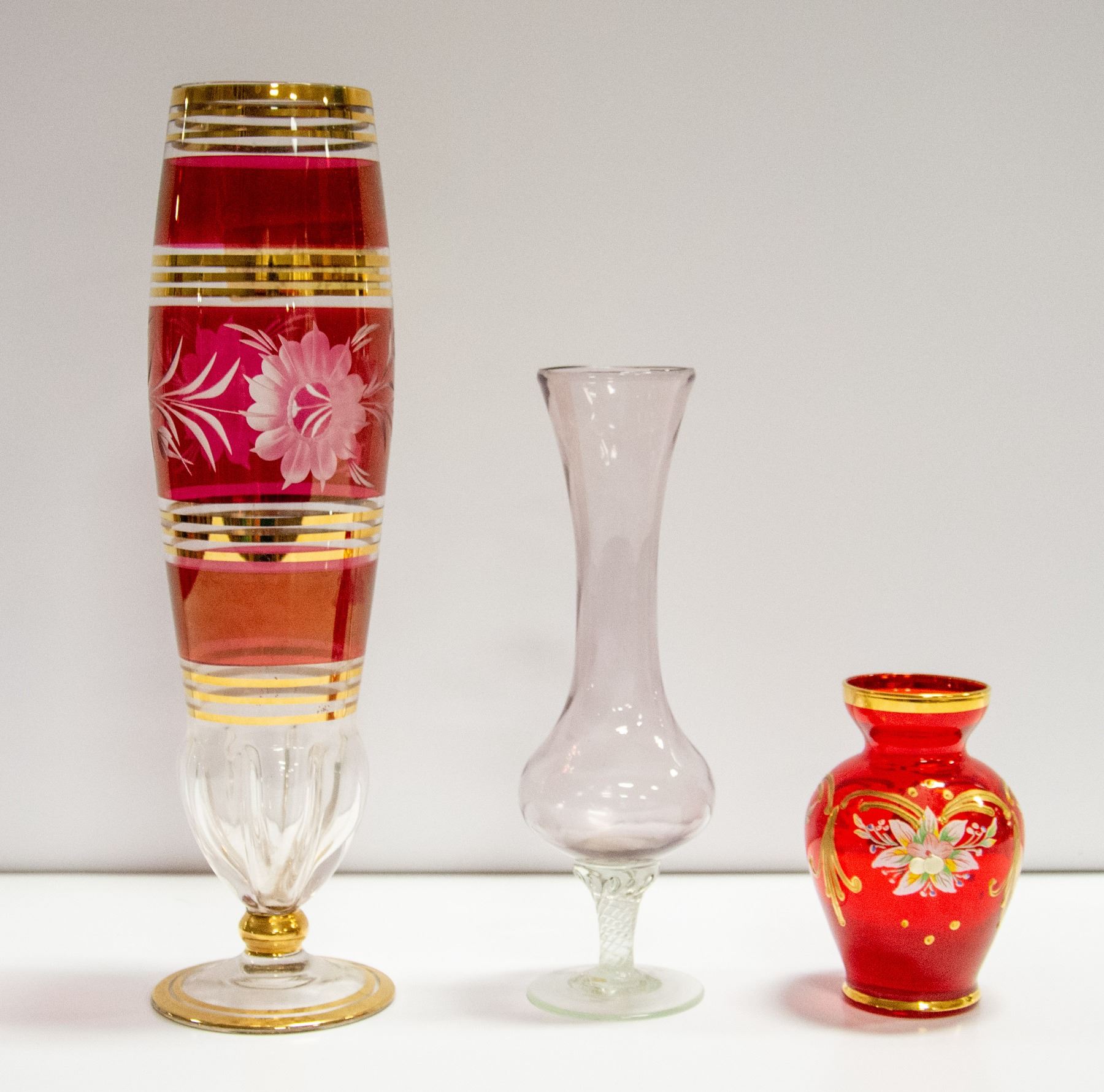 VINTAGE TALL CRANBERRY VASE W/ OTHER VASES