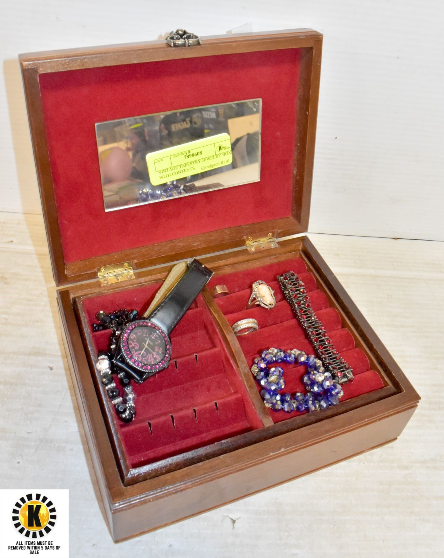 VINTAGE TAPESTRY JEWELRY BOX WITH CONTENTS