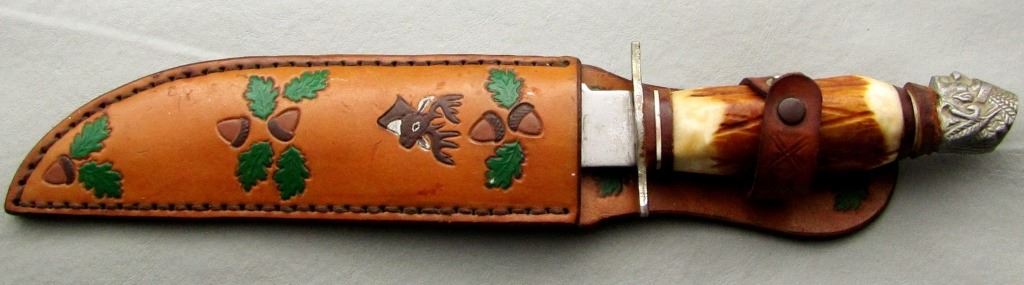 MARKED JAPAN. BONEHANDLE INDIAN HEAD 8 1/4 INCH BLADE. FIXED WITH SHEATH. HUNTING/FISHING KNIFE