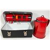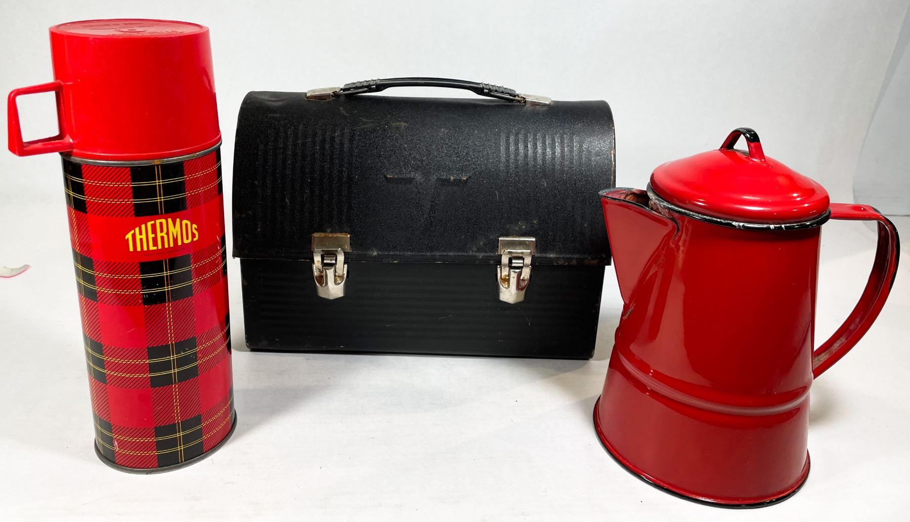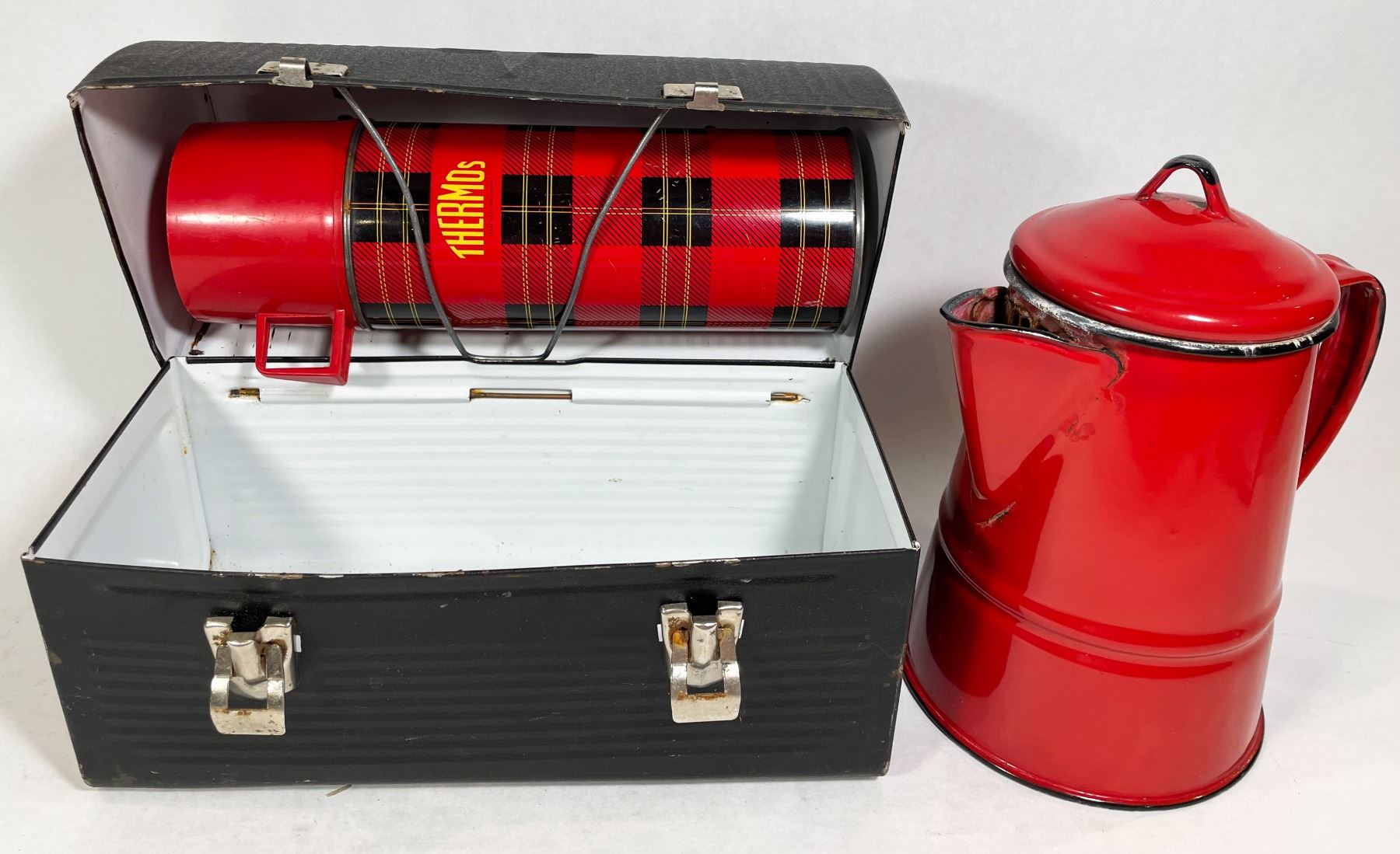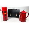 VINTAGE BLACK LUNCH BOX, RED ENAMEL COFFEE POT 7.5" TALL***ITEM(S) LOCATED IN LETHBRIDGE ALBERTA. ALL ITEMS IN THIS AUCTION QUALIFY FOR OUR FREE TRANSPORT TO EDMONTON SERVICE. WORLDWIDE SHIPPING AVAILABLE