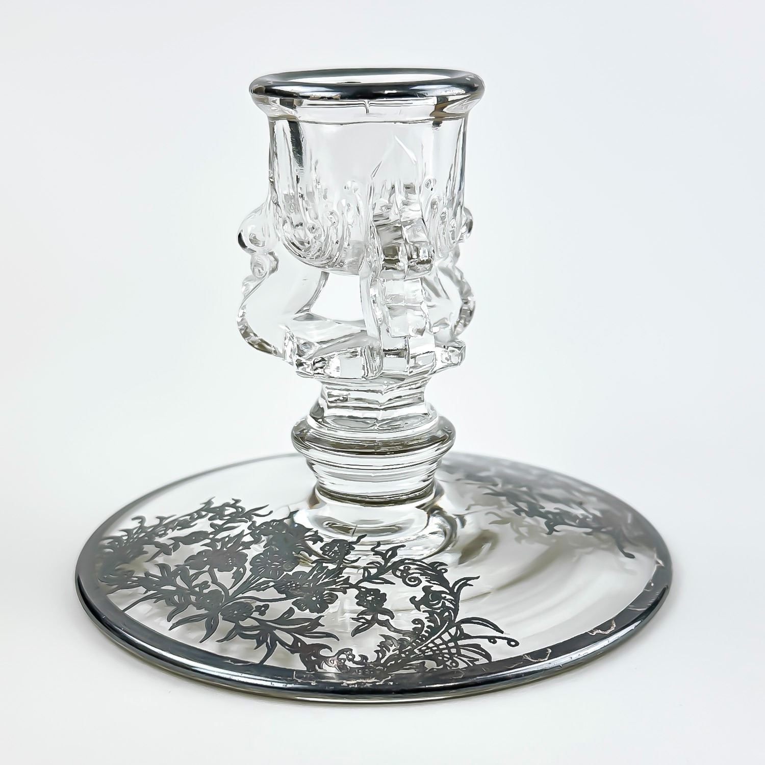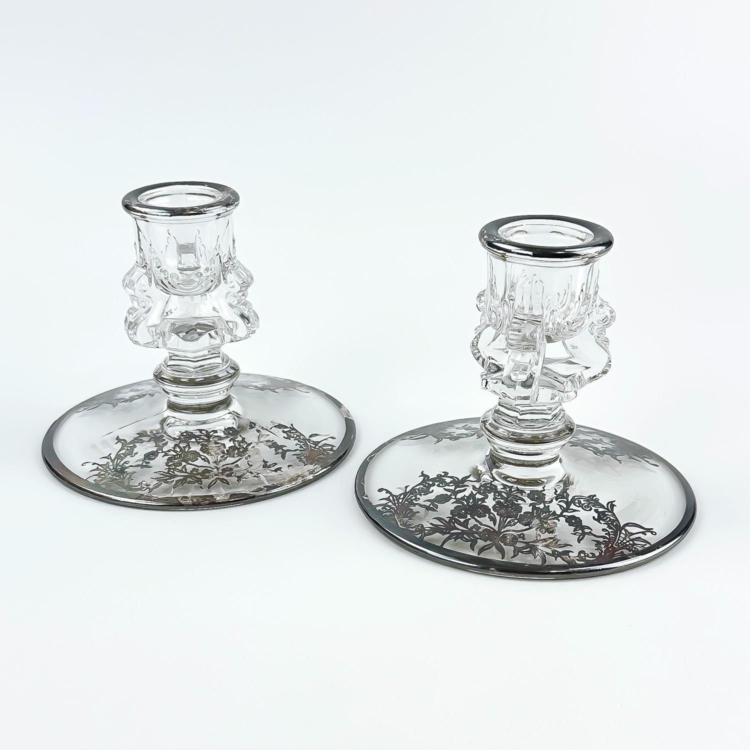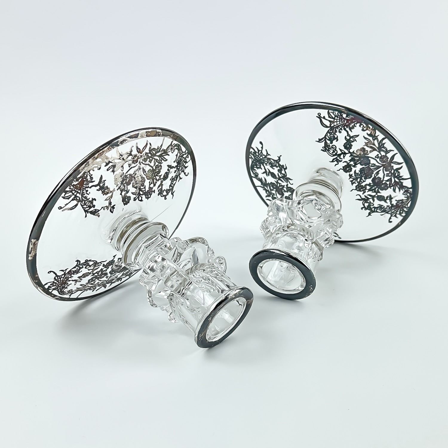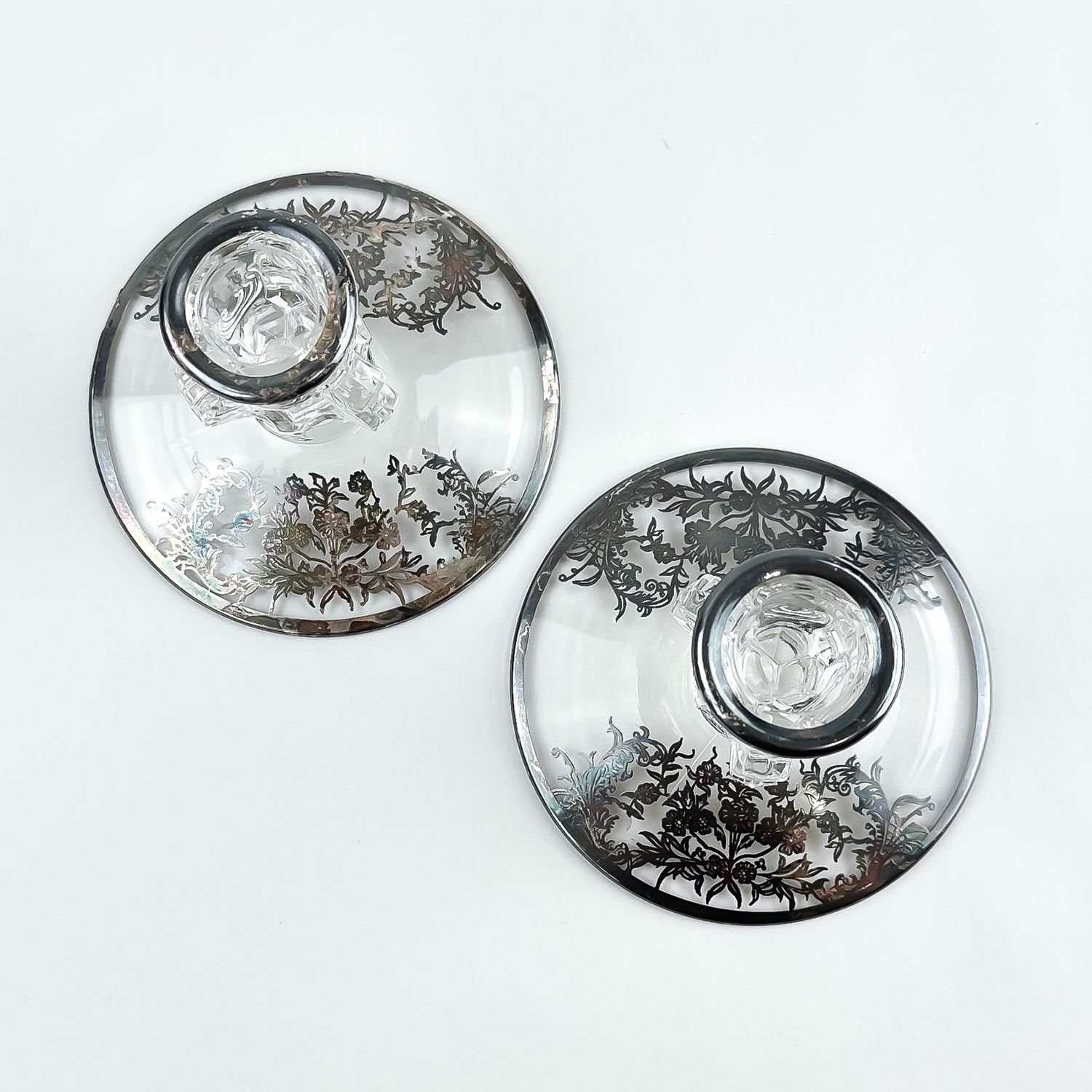 #8437 - PAIR OF VINTAGE TIFFIN-FRANCISCAN CANDLE HOLDERS WITH SILVER FLORAL DESIGN TRIM. NO CRACKS, CHIPS OR REPAIRS - SILVER IS UNPOLISHED. THEY MEASURE 3.5” (9 CM) TALL BY 4.5” (11.5 CM) DIAMETER BASE