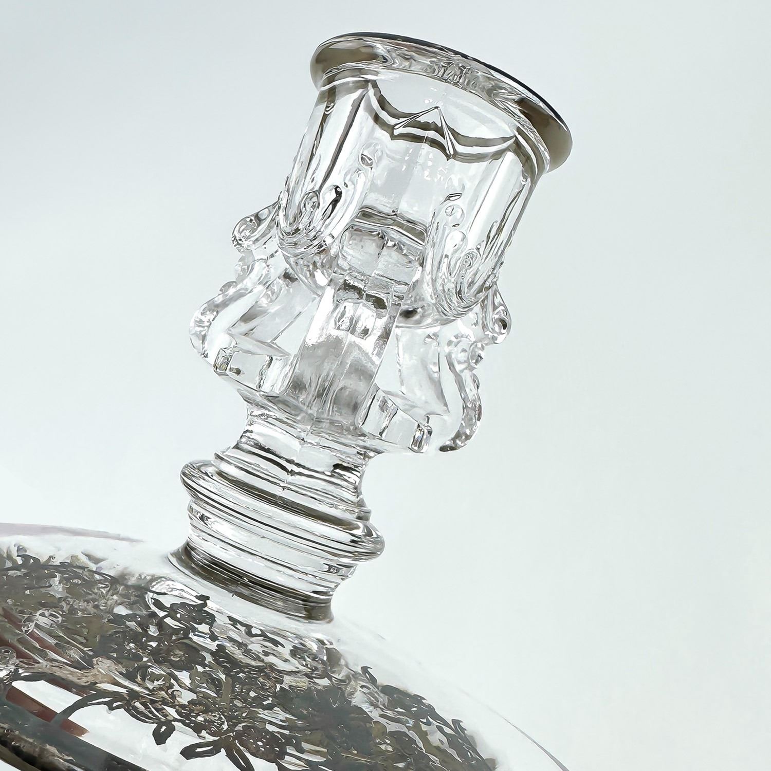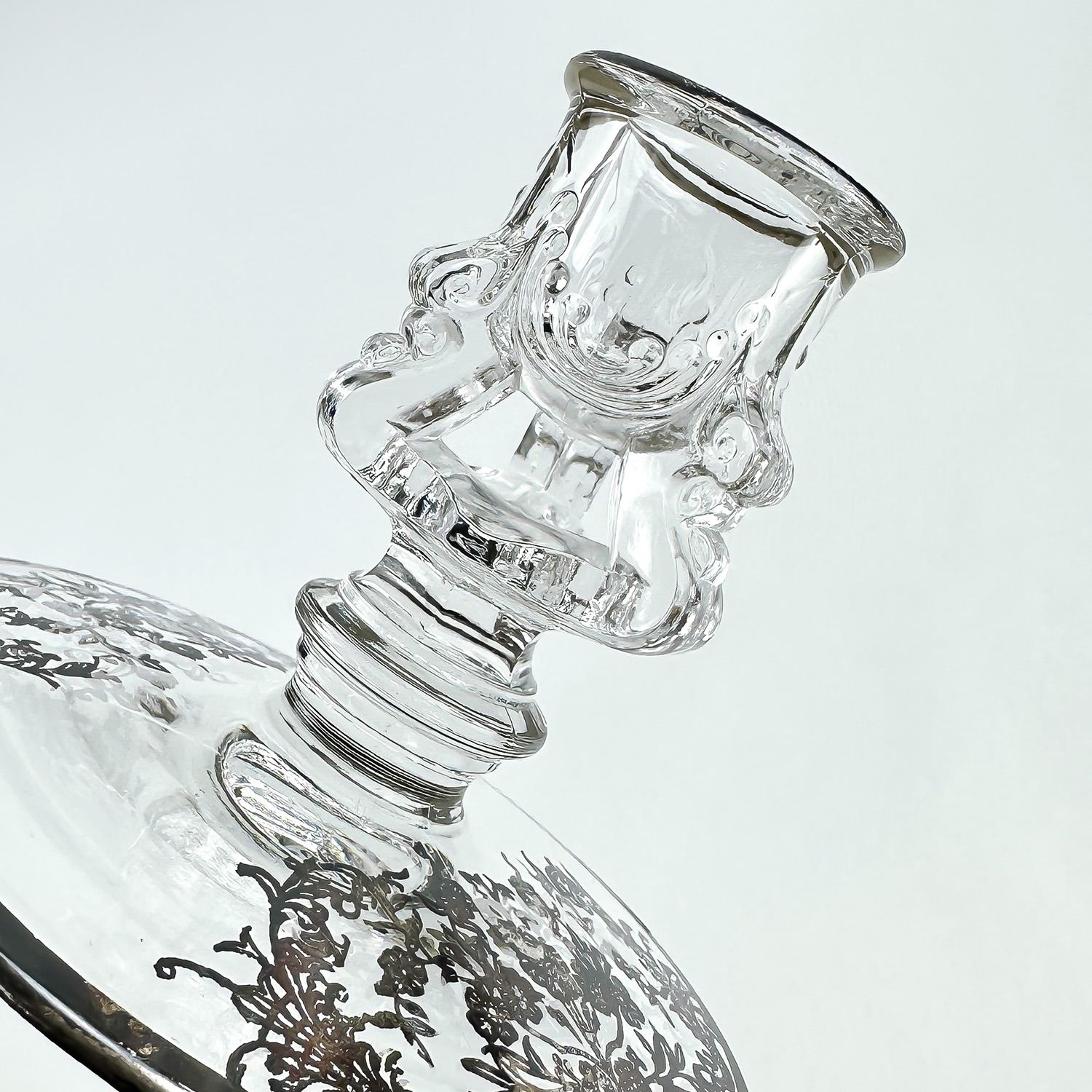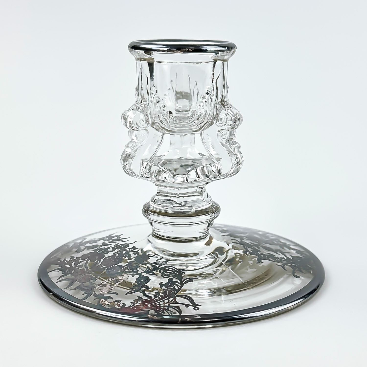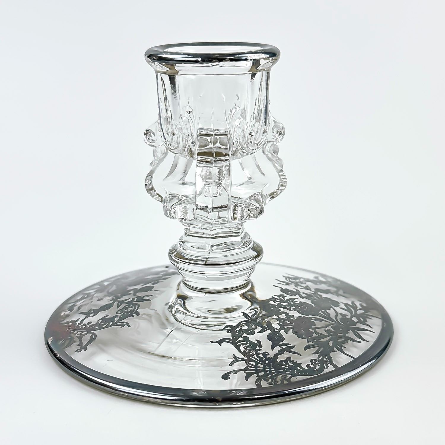 #8437 - PAIR OF VINTAGE TIFFIN-FRANCISCAN CANDLE HOLDERS WITH SILVER FLORAL DESIGN TRIM. NO CRACKS, CHIPS OR REPAIRS - SILVER IS UNPOLISHED. THEY MEASURE 3.5” (9 CM) TALL BY 4.5” (11.5 CM) DIAMETER BASE