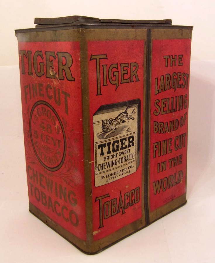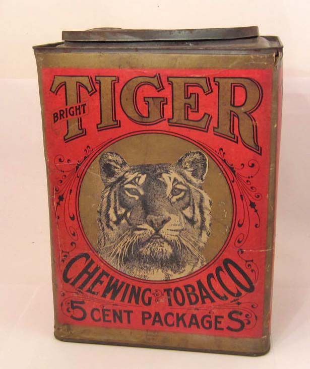 VINTAGE TIGER CHEWING TOBACCO STORE COUNTER ADVERTISING DISPLAY - 5 CENTS - 11.5" tall - Top & Bottom are tin but sides are Heavy Cardboard