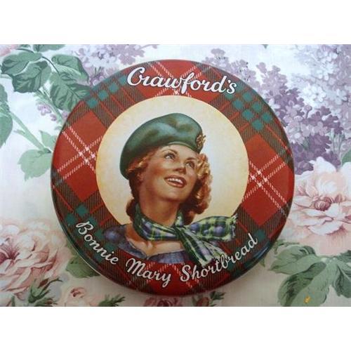 BEAUTIFUL VINTAGE TIN BOX, MADE IN ENGLAND BY WILLIAM CRAWFORD & SONS, DEPICTING, CRAWFORD'S BONNIE MARY, THE TIN CONTAINED SHORTBREAD, Measuring about 8 inch in diam., and 1 1/2 inch high,US Buyer to pay 7.00 for shipping plus insurance.THANKS.