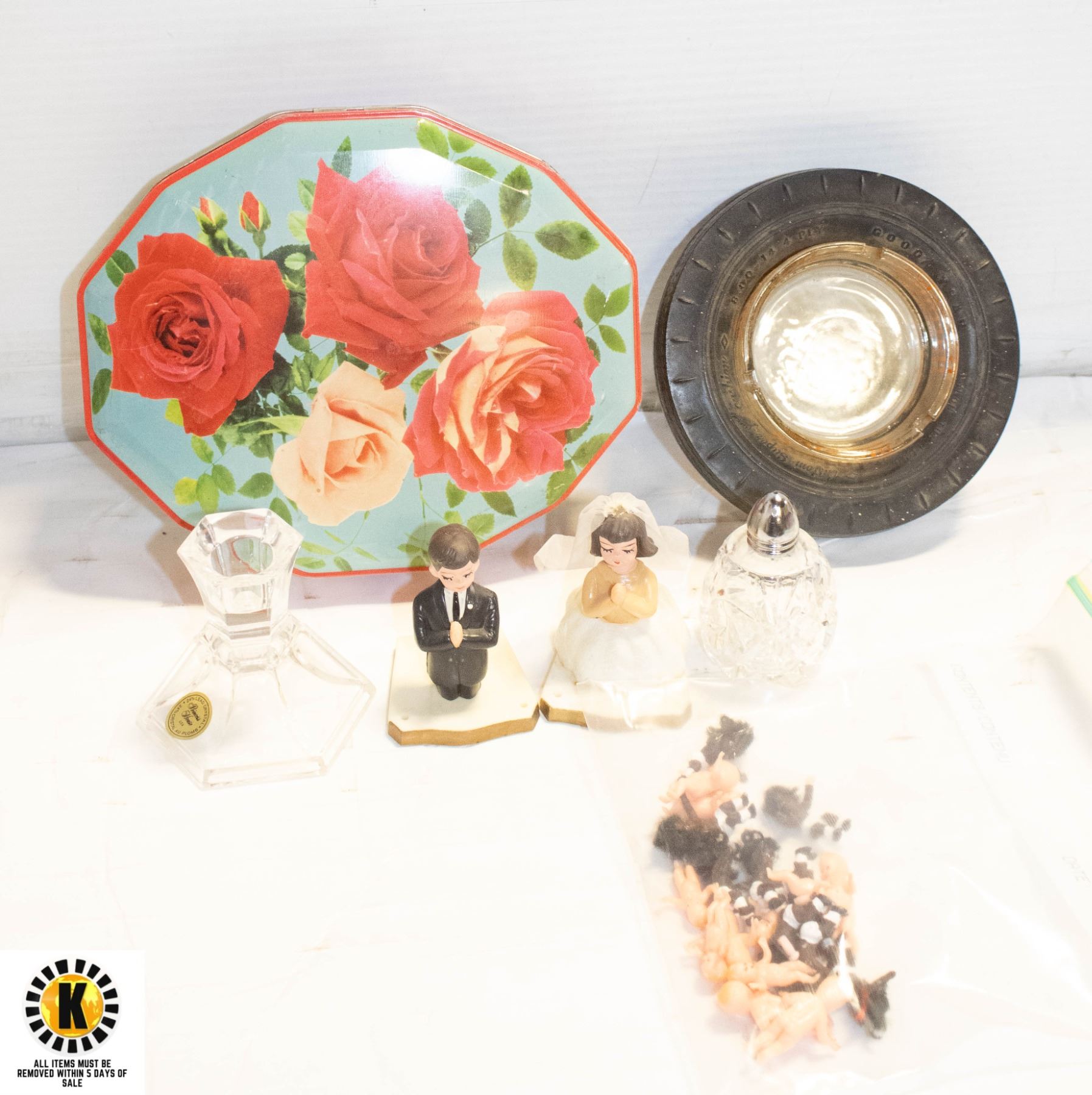 VINTAGE TIN BOX, TIRE ASHTRAY,WEDDING COUPLE FOR