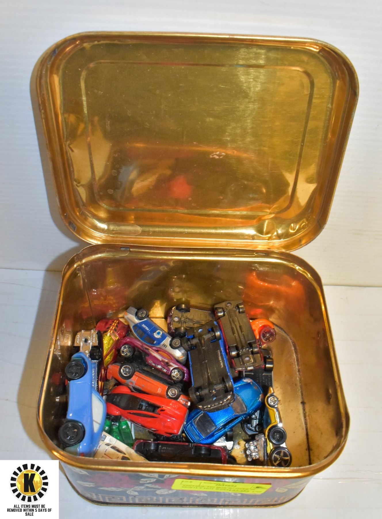 VINTAGE TIN BOX W/ OVER 20 MOSTLY HOT WHEELS CARS