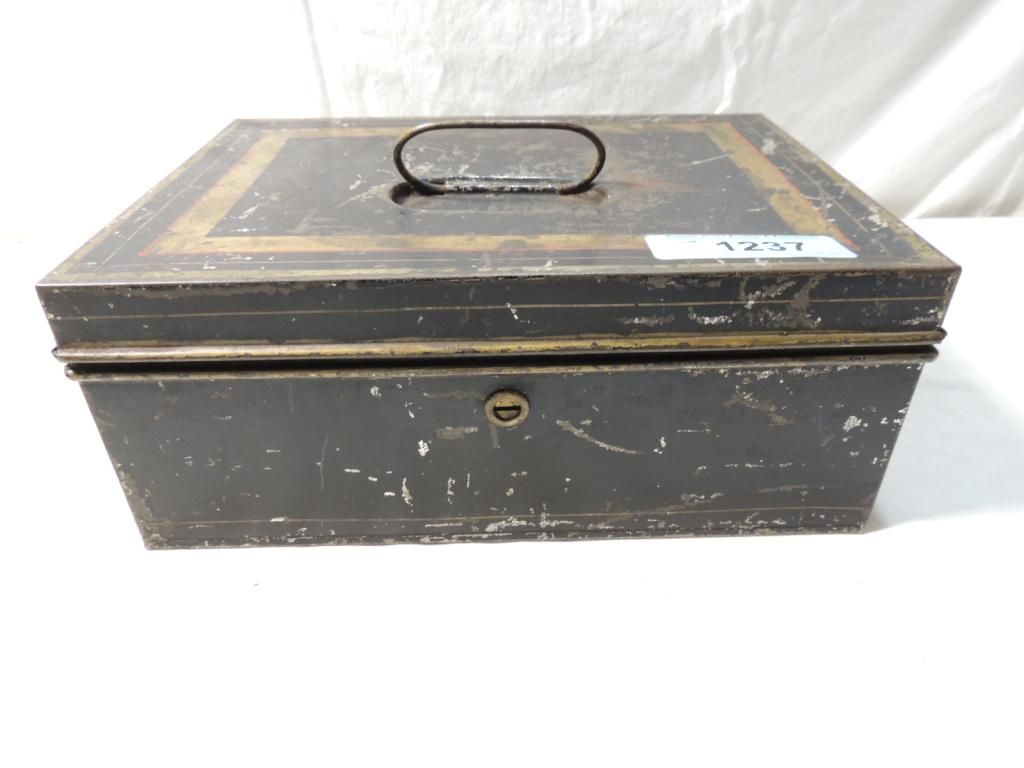 VINTAGE TIN BOX WITH HANDLE AND LOCK. WORN . AS SHOWN. SEE PHOTO FOR MORE DETAILS.