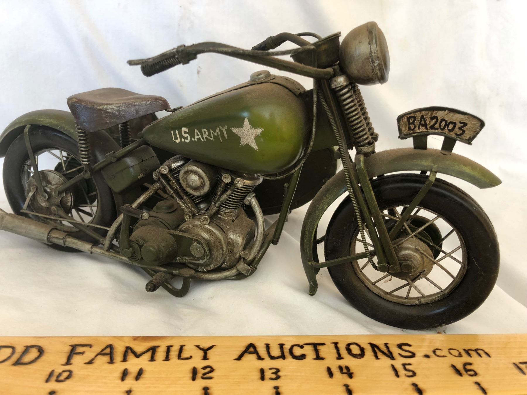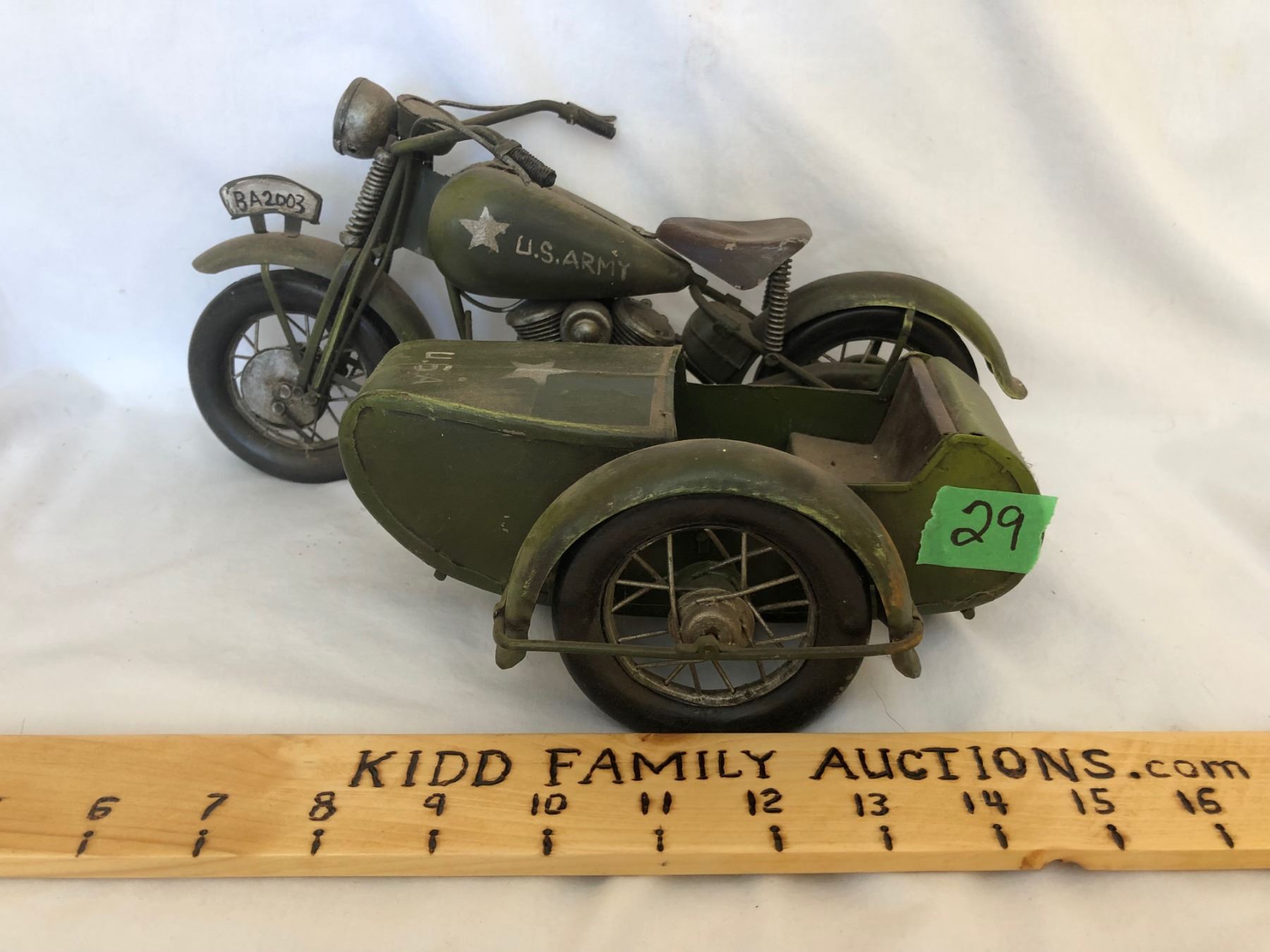 VINTAGE TIN MOTORCYCLE WITH SIDE CAR - MARKED U.S. ARMY