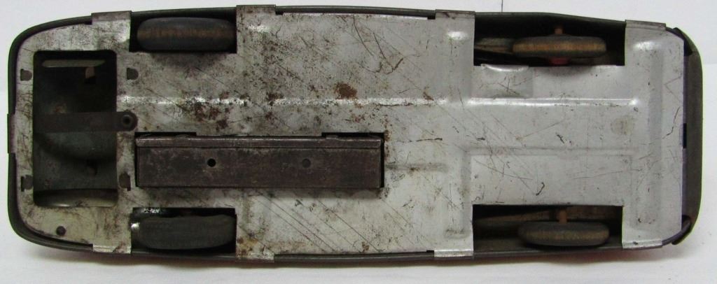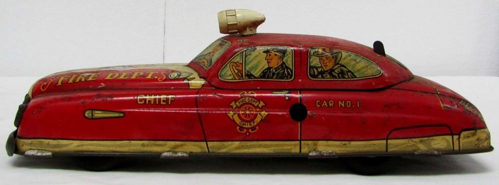 TIN TOY WIND UP. MISSING KEY AND TOP LIGHT(BULB). UNSURE IF THIS IS WORKING SO THIS WILL BE AN AS-IS FOR RESTORATION PIECE. MEASURES ABOUT 11" LONG. SCRAPES, SCRATCHES, AND DENTS/DINGS ARE PRESENT. SOME