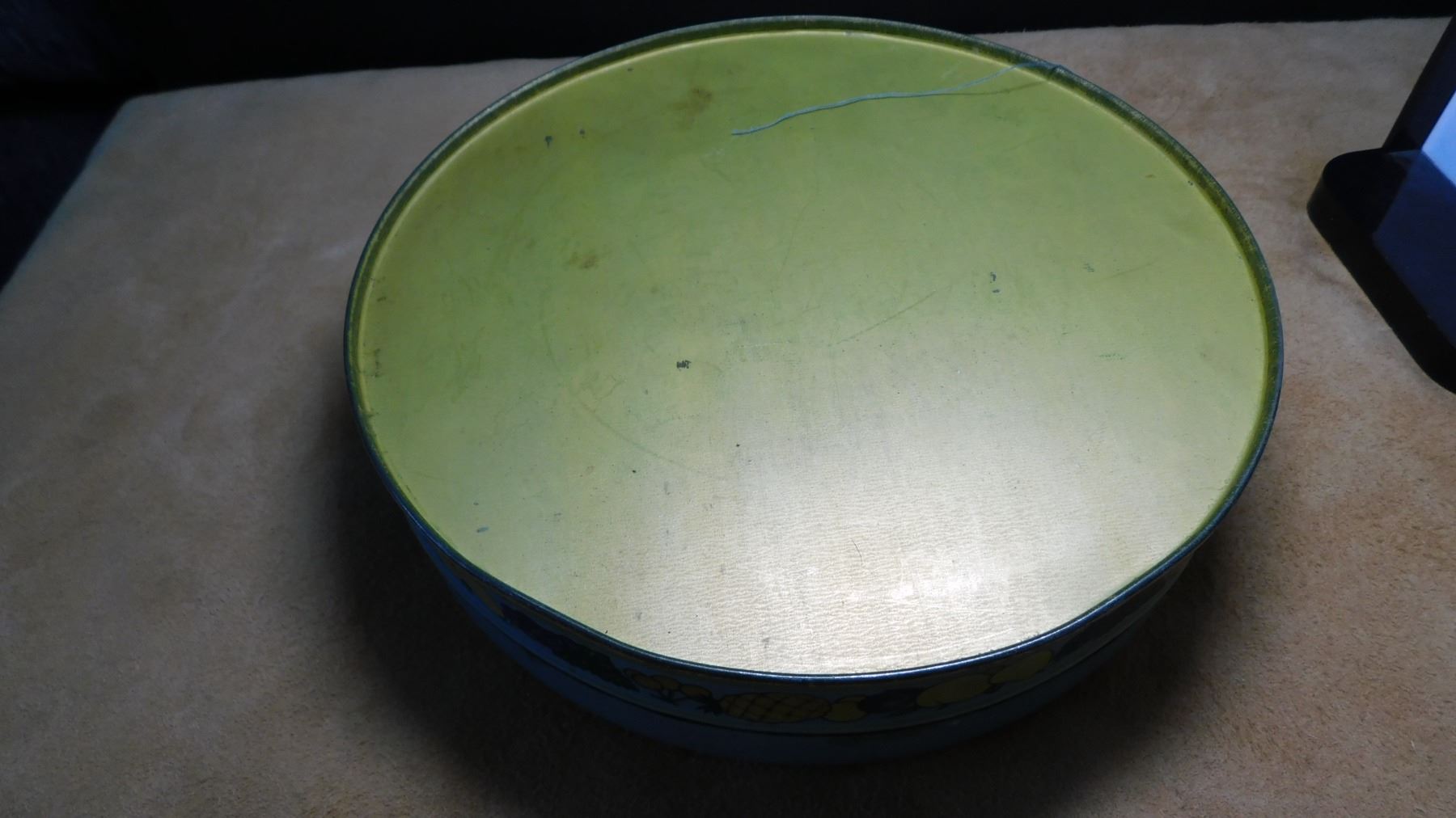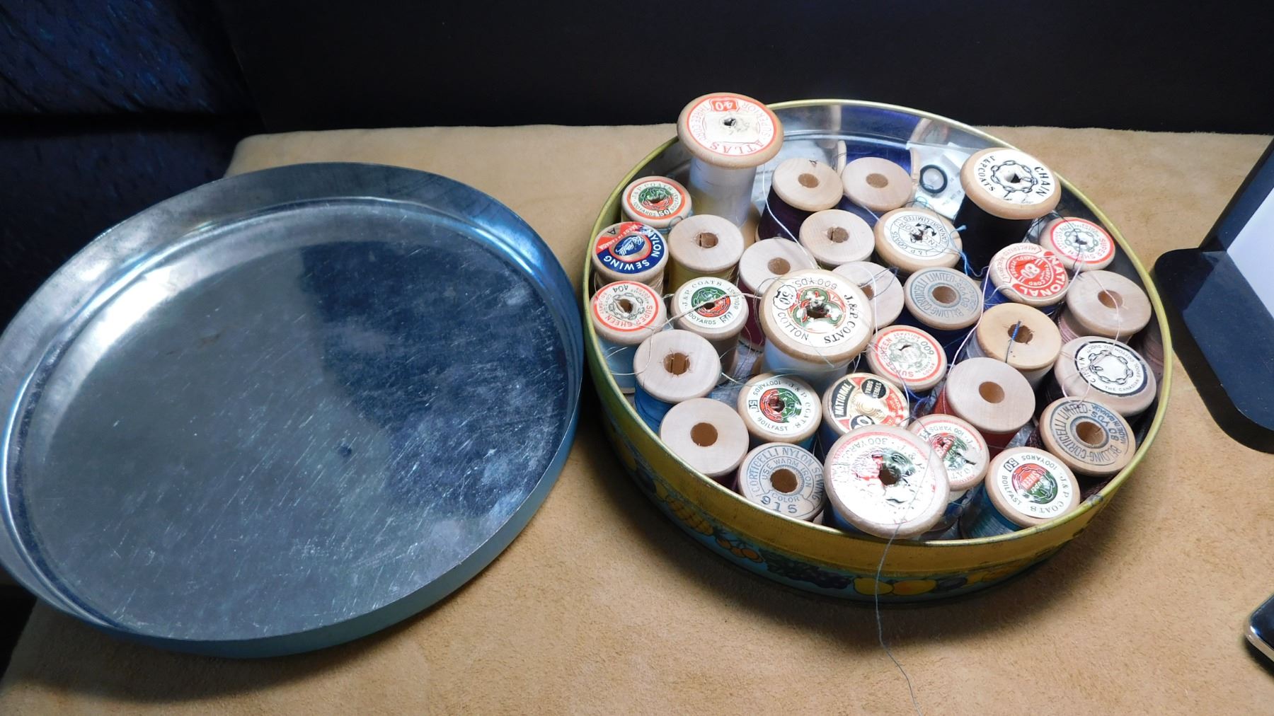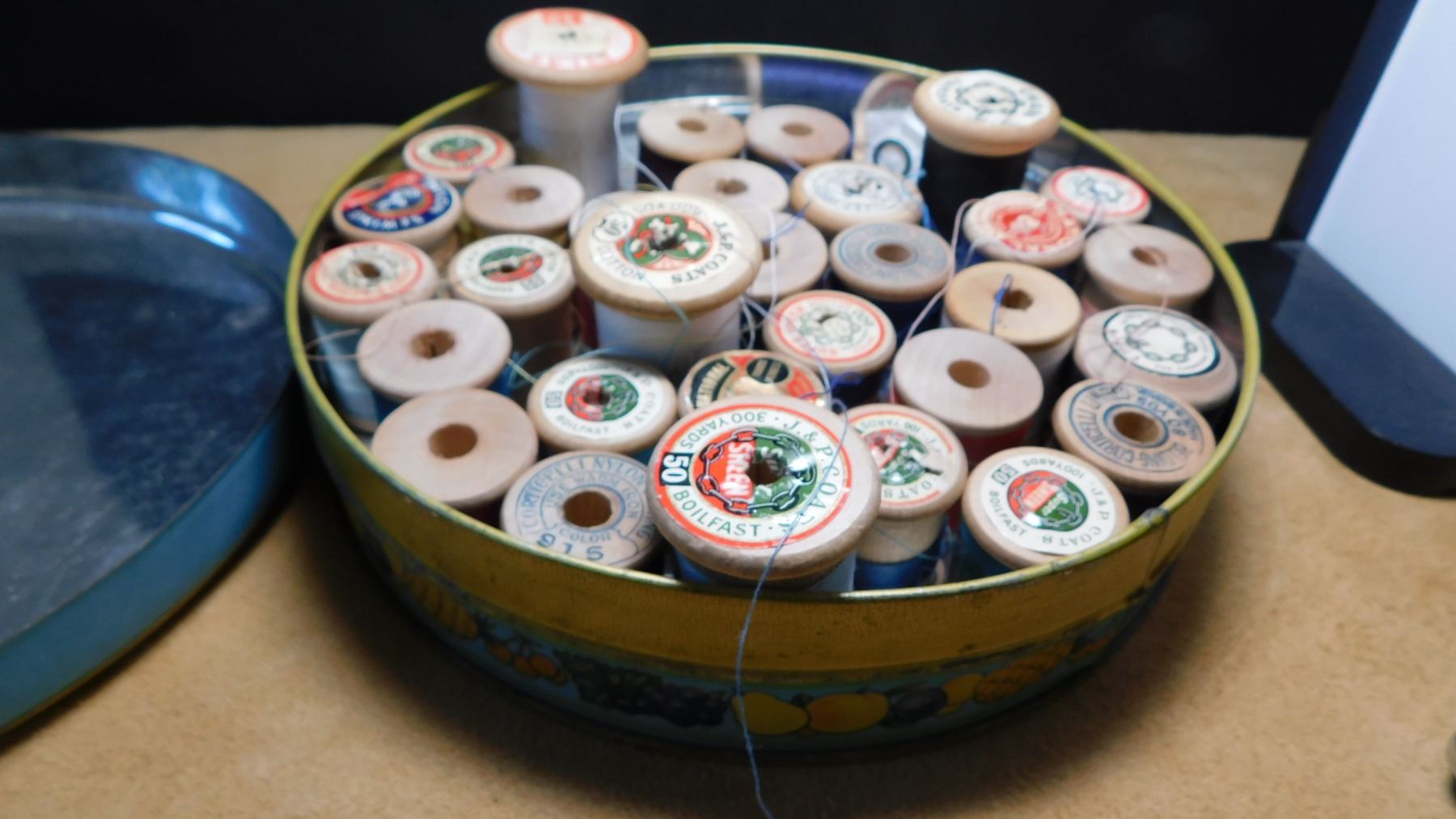 VINTAGE TIN WITH WOODEN SPOOLS AND THREAD
