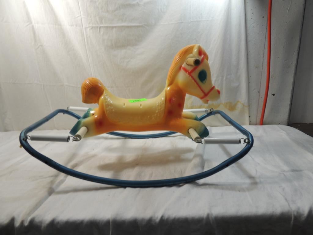 VINTAGE ROCKING HORSE FOR TODDLER SPRING LOADED JUMPER PLASTIC AND METAL FRAME. VINTAGE CHILDRENS TOY ROCKING HORSE AS SHOWN SEE PHOTO FOR MORE DETAILS.