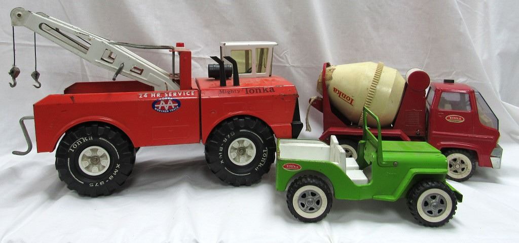LIME GREEN TONKA JEEP, TONKA CEMEMNT MIXER- PRESSED STEEL, 1970'S TONKA MIGHTY DOUDLE BOOM WRECKER AA 24 HOUR SERVICE TOW TRUCK EXACT SHIPPING