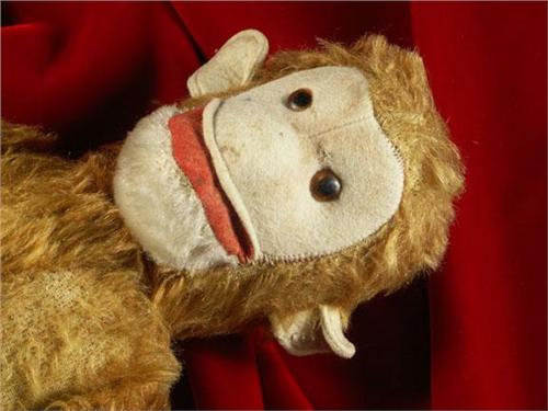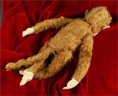 VINTAGE TOY: An articulated stuffed monkey child's toy with felt face, feet and hands, rotating head, glass eyes, and interior wire frame, unattributed, possibly French, measures 19''L, shows wear commensurate with age, left ear and felt section above left eye have been lovingly repaired.
