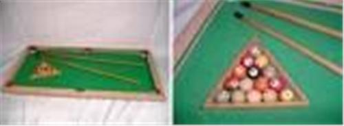 VINTAGE TOY BILLIARD TABLE WITH FELT TOP, 2 POOL CUES, RACK, AND BALLS. 29" X 16"