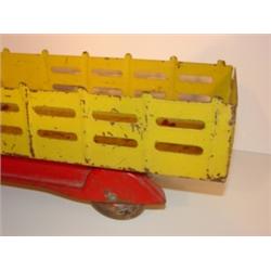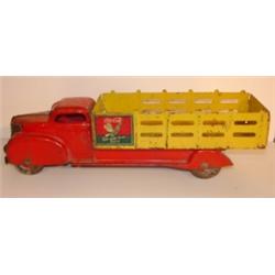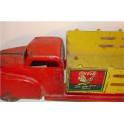 VINTAGE TOY COCA-COLA TRUCK. Decal on stake body reads “Coca-Cola-Take some home today”. Truck shows signs of severe rusting and loss to paint. 20.5” L