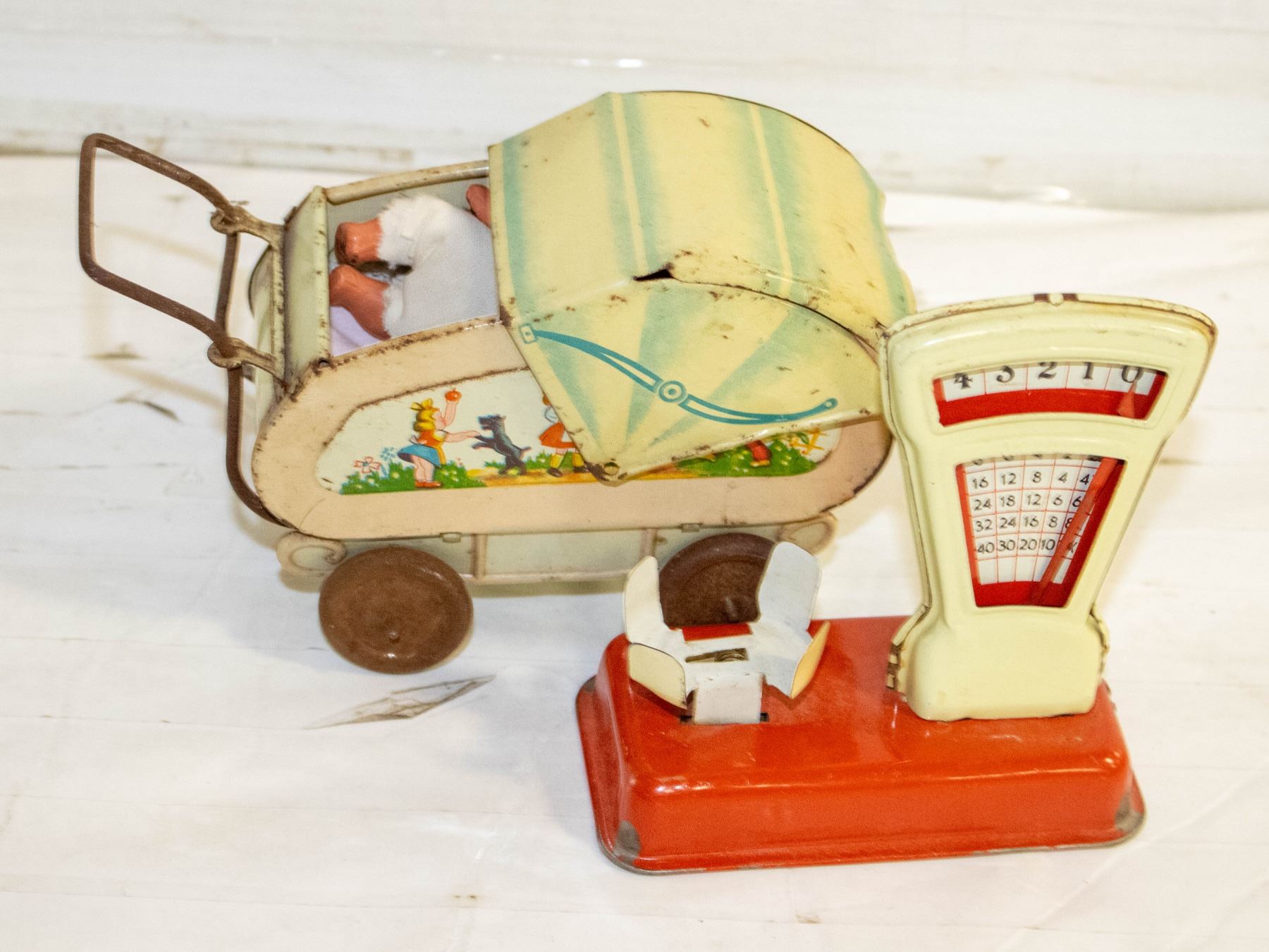 VINTAGE TOY STROLLER AND WEIGHT SCALE