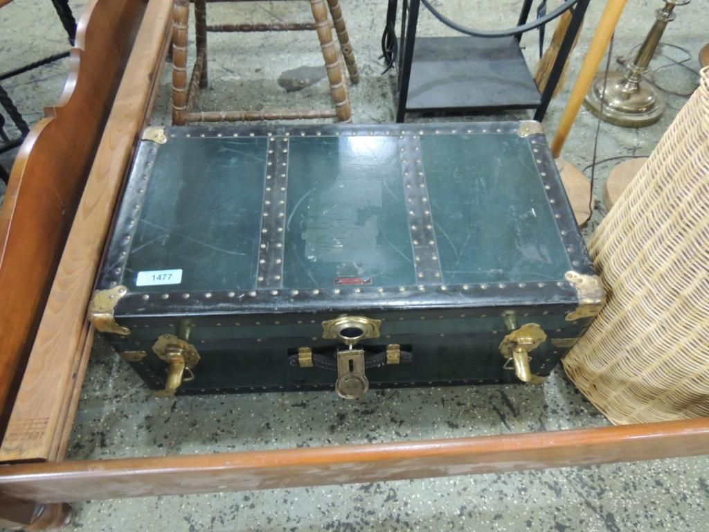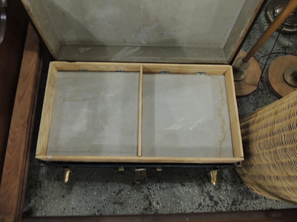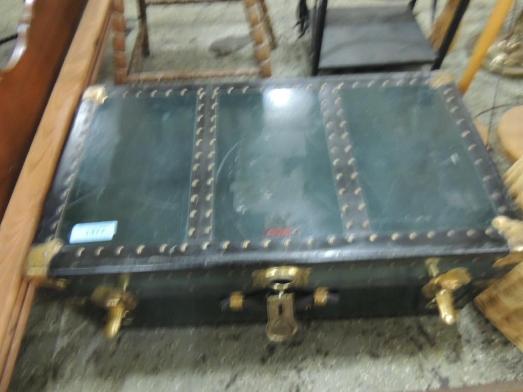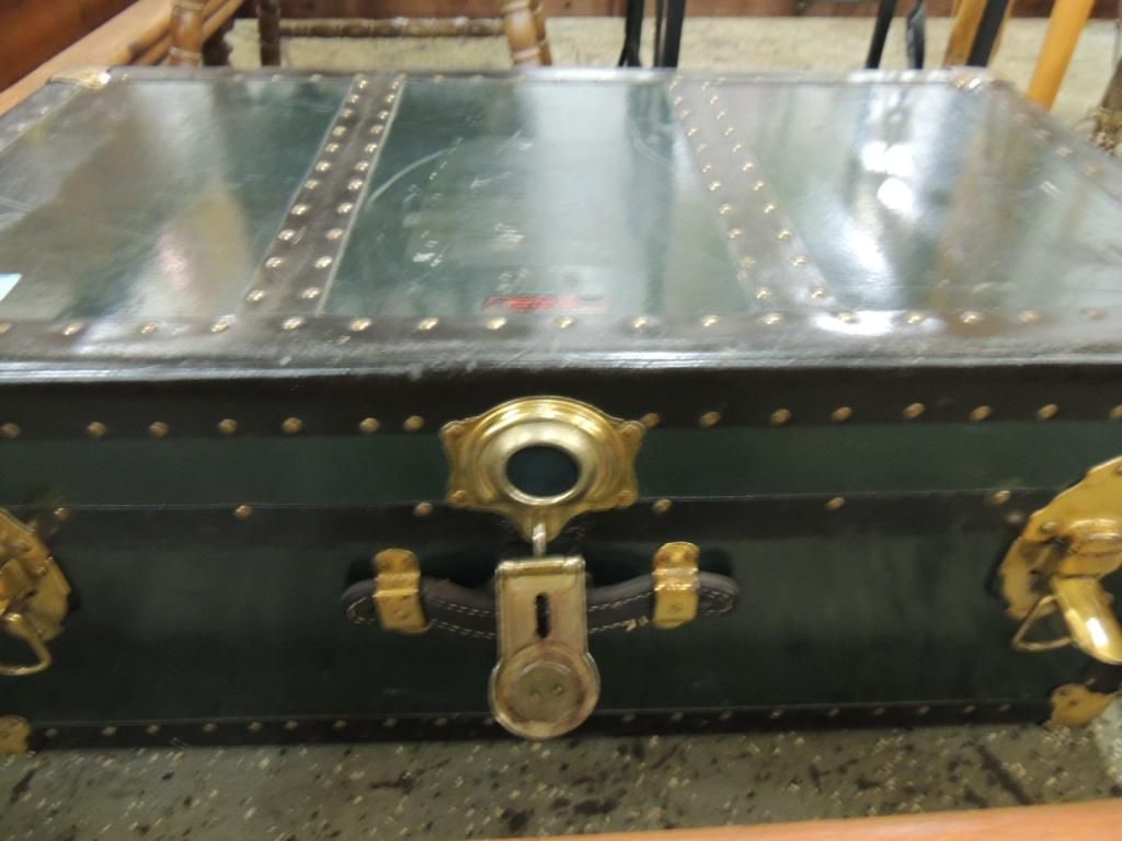 VINTAGE BLACK TRAVEL TRUNK AS SHOWN SEE PHOTO FOR MORE DETAILS.