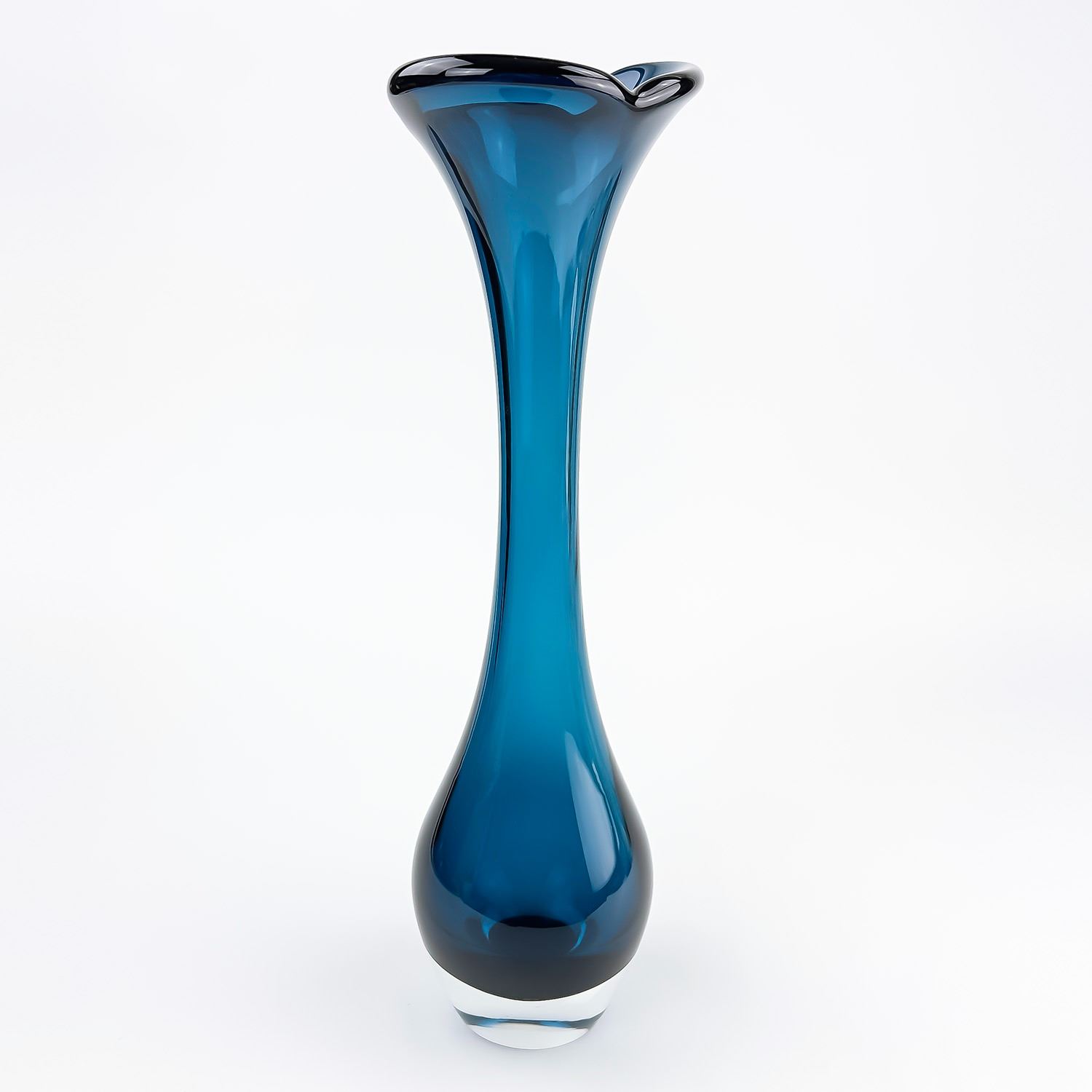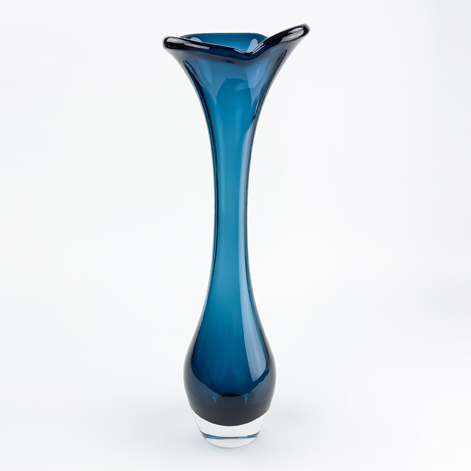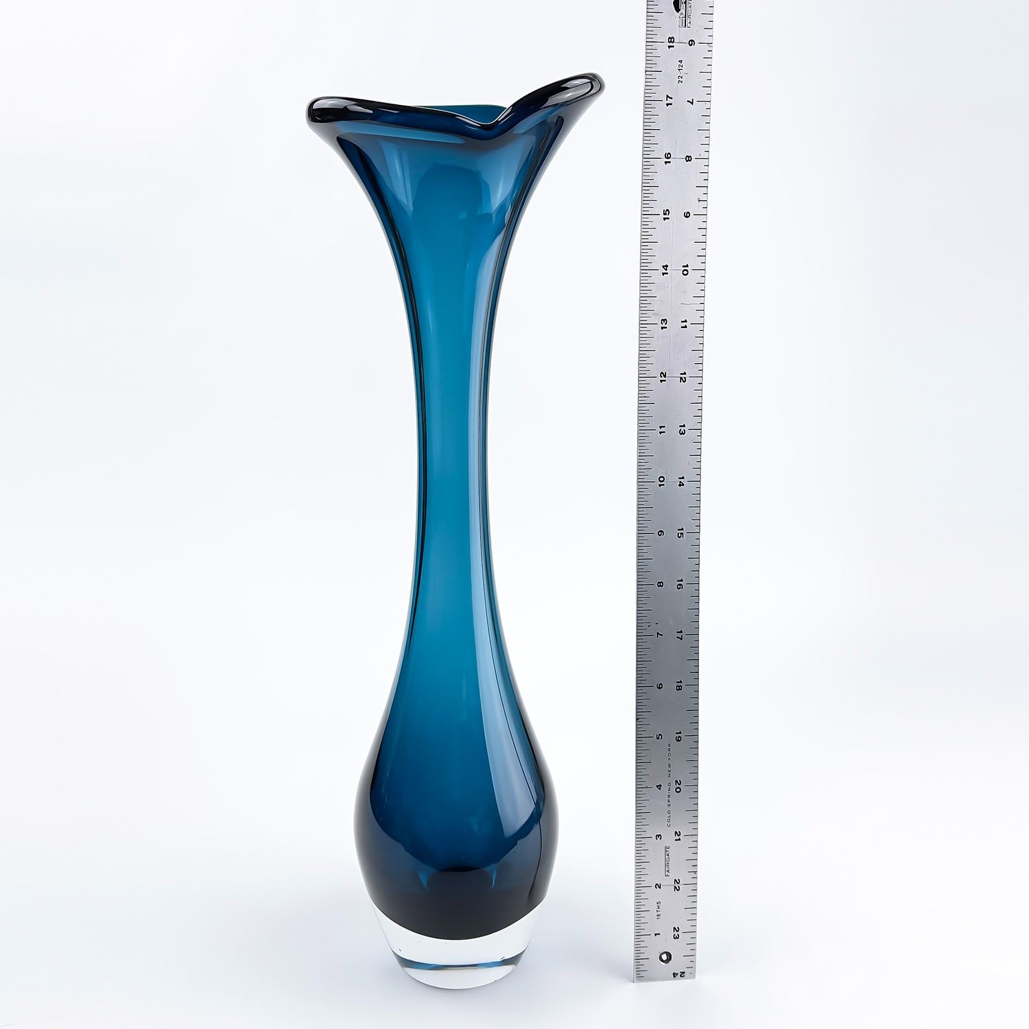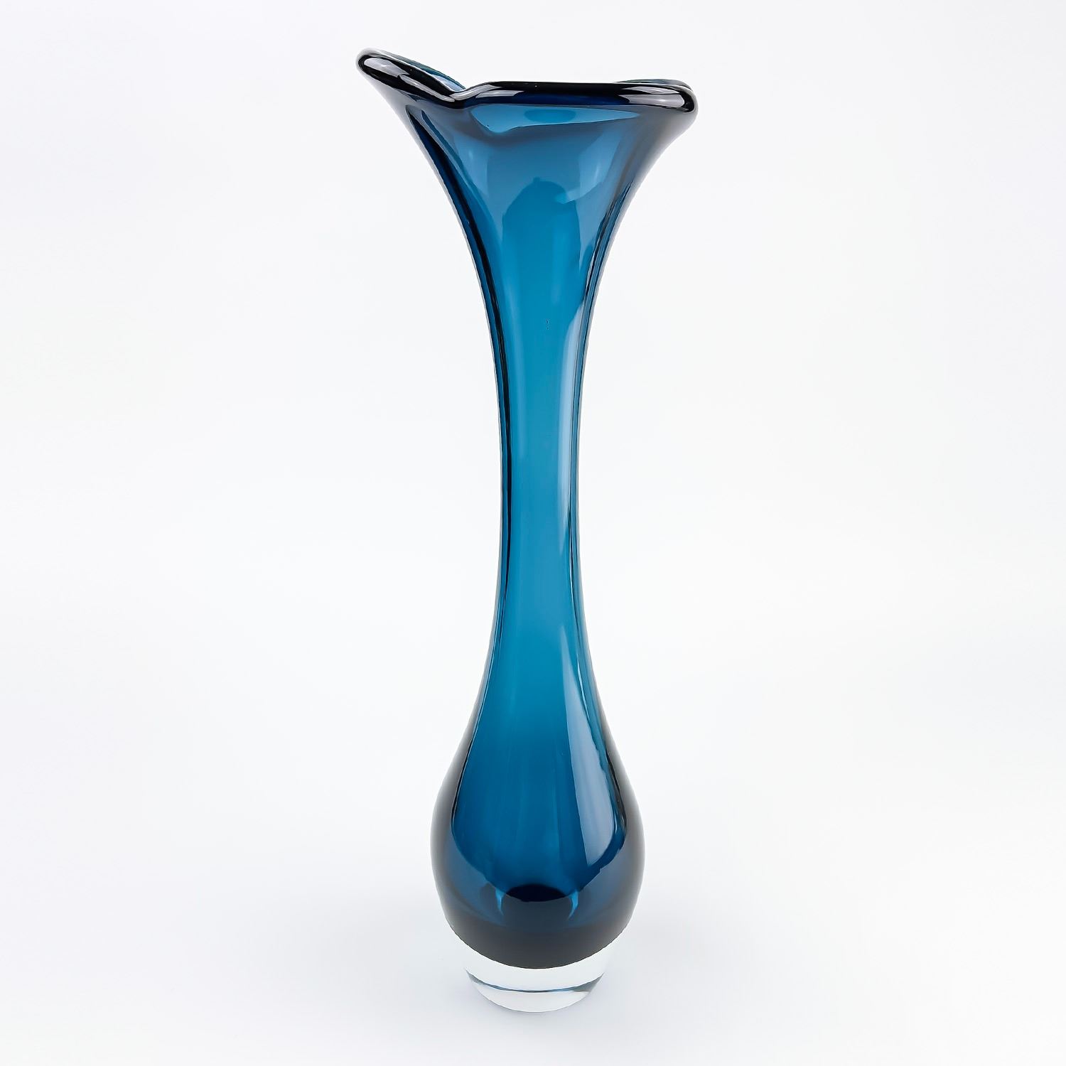 #8114 - VINTAGE MCM MID-CENTURY-MODERN GLASS FLOWER VASE - TALL BONE-LIKE SWUNG GLASS SHAPED DESIGN. TRUMPET, FLARE TOP OR JACK IN THE PULPIT STYLE. COLLECTIBLE STUDIO ART GLASS VASE SCULPTURE FOR HOME OR OFFICE DECOR. NO CRACKS, CHIPS OR REPAIRS. THIS IS A TALL HEAVY GLASS VASE. MEASURES: 17.25” (44 CM) TALL BY APPROX 4.5” (11 CM) AT WIDEST BODY DIAMETER. WEIGHS: 4.5 POUNDS (2 KILOGRAMS).
