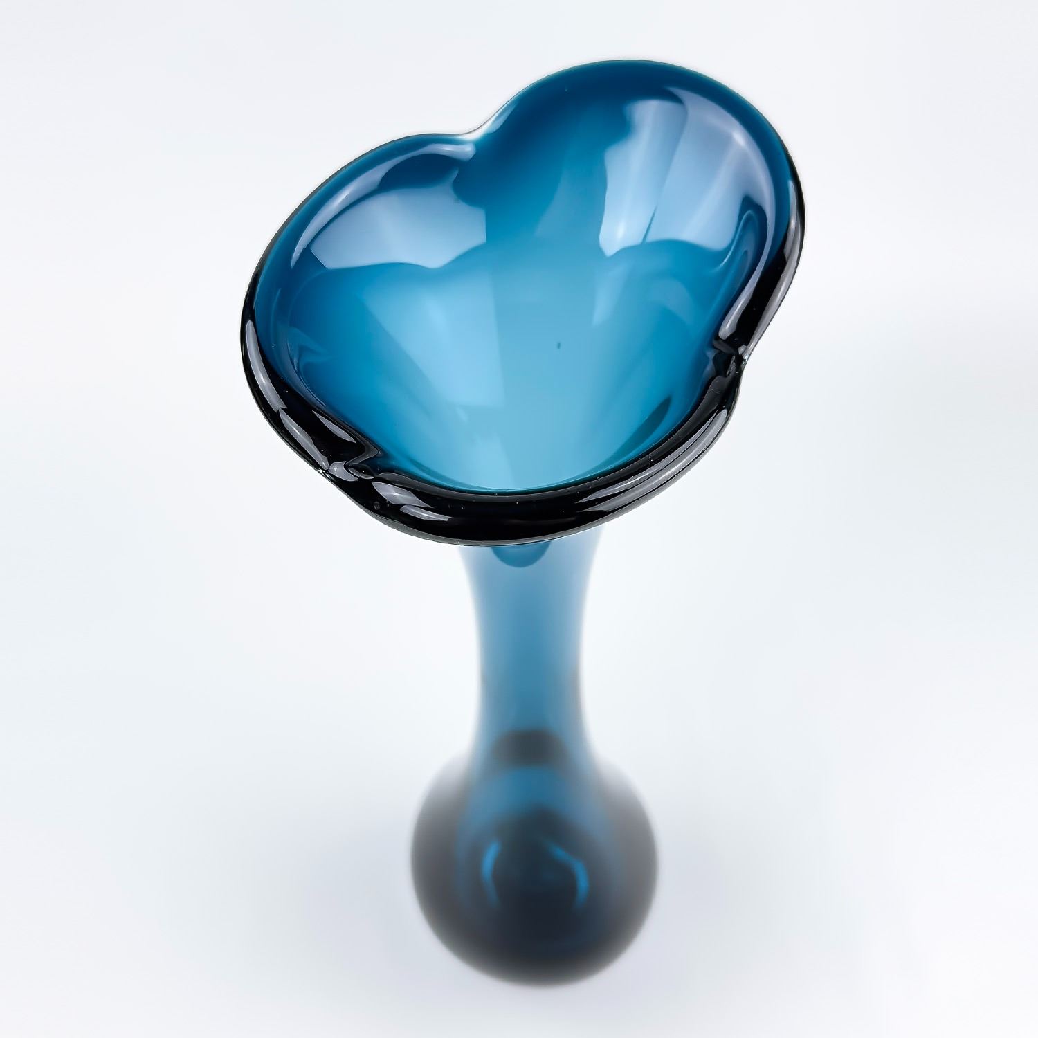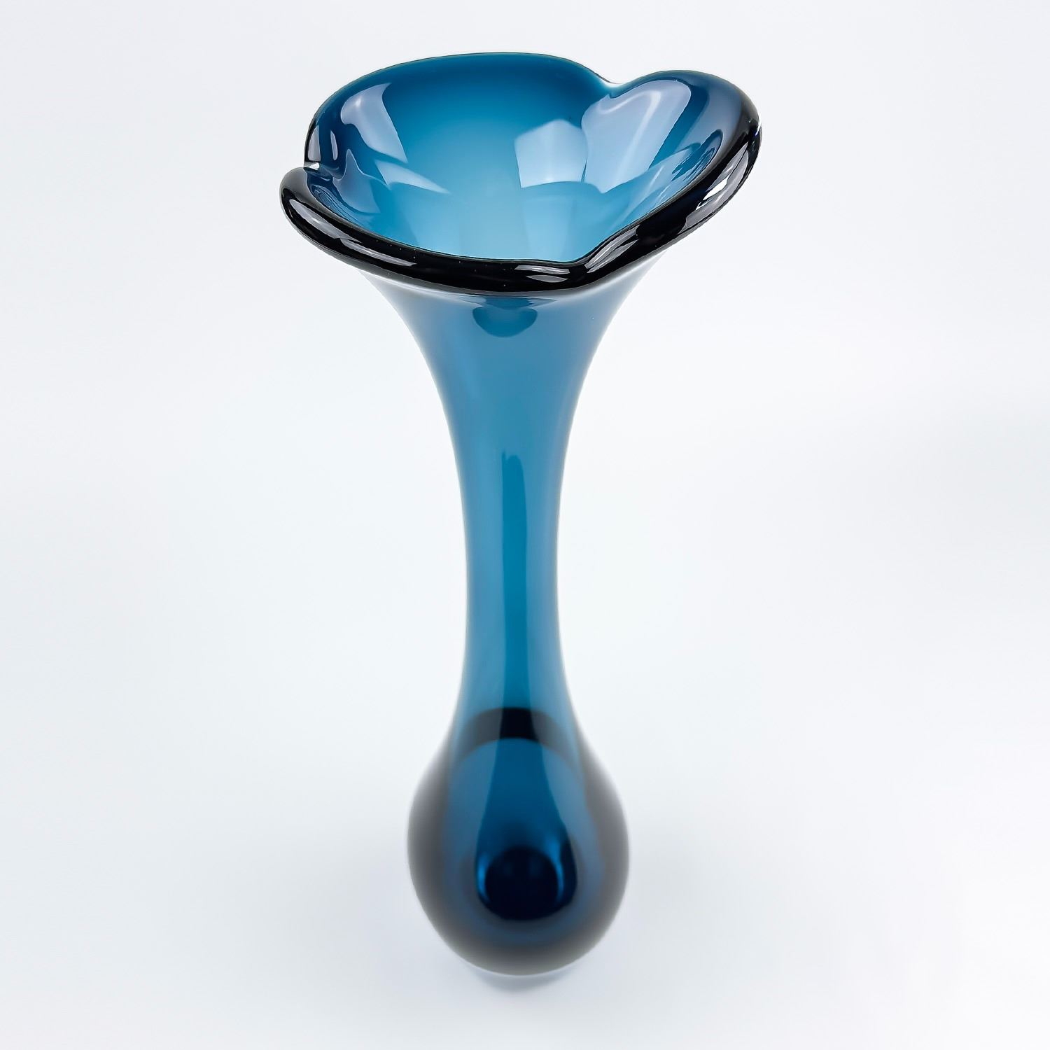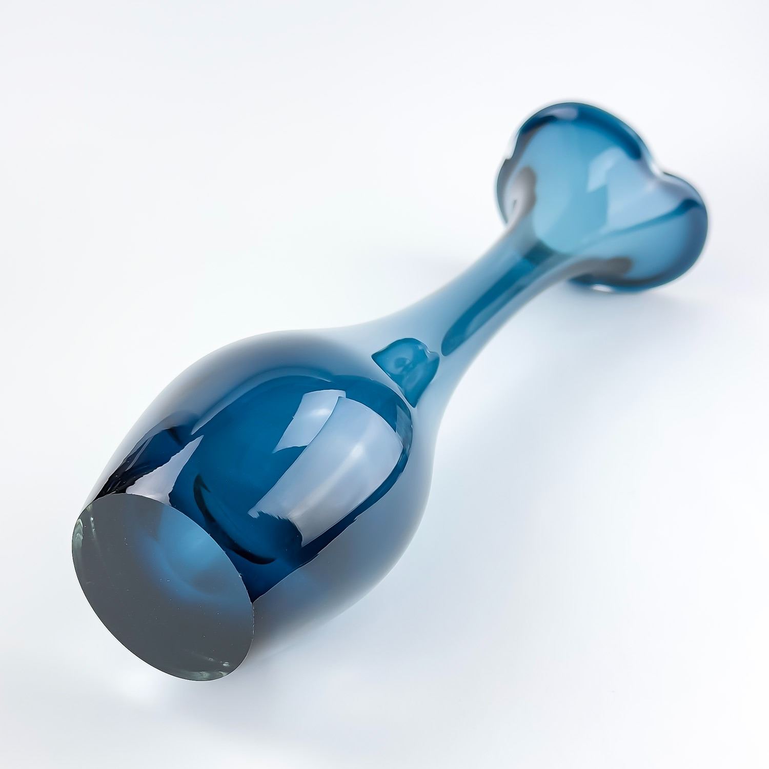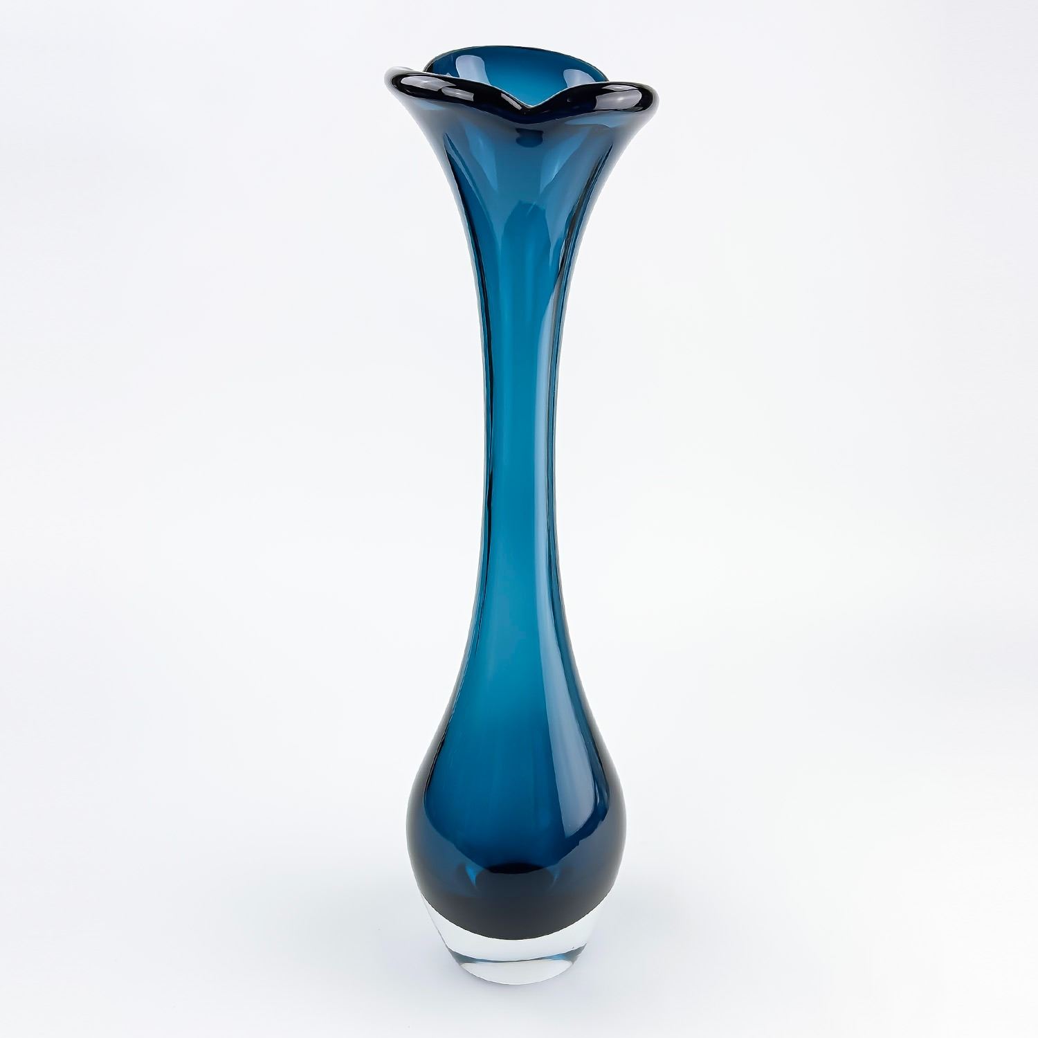 #8114 - VINTAGE MCM MID-CENTURY-MODERN GLASS FLOWER VASE - TALL BONE-LIKE SWUNG GLASS SHAPED DESIGN. TRUMPET, FLARE TOP OR JACK IN THE PULPIT STYLE. COLLECTIBLE STUDIO ART GLASS VASE SCULPTURE FOR HOME OR OFFICE DECOR. NO CRACKS, CHIPS OR REPAIRS. THIS IS A TALL HEAVY GLASS VASE. MEASURES: 17.25” (44 CM) TALL BY APPROX 4.5” (11 CM) AT WIDEST BODY DIAMETER. WEIGHS: 4.5 POUNDS (2 KILOGRAMS).