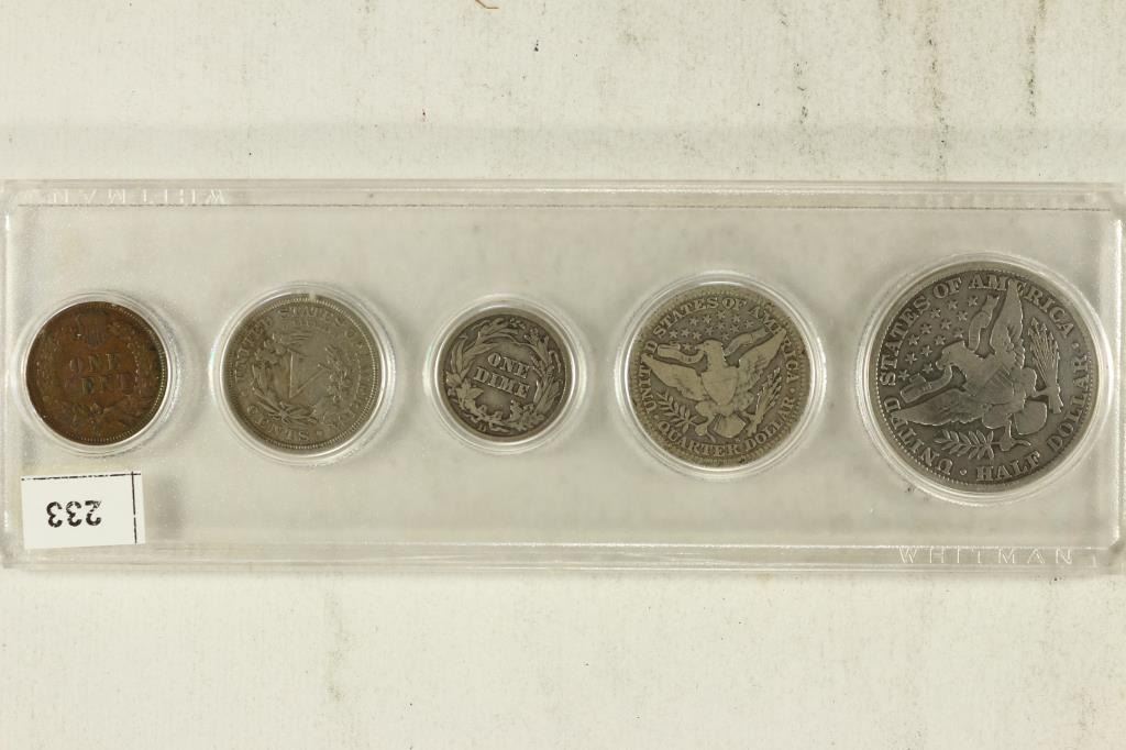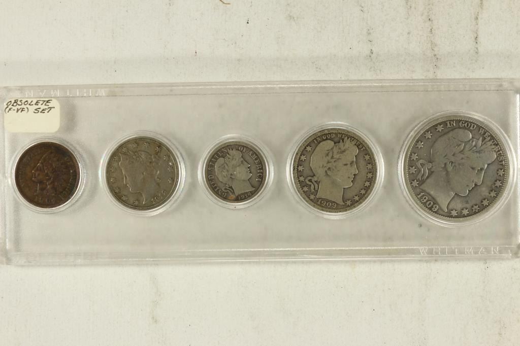 1912 LIBERTY "V" NICKEL, 1914-D BARBER DIME, 1909-S BARBER QUARTER AND 1909 BARBER HALF DOLLAR, ALL COINS FINE TO VERY FINE