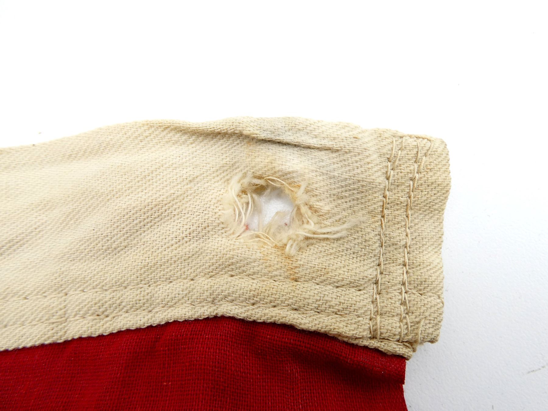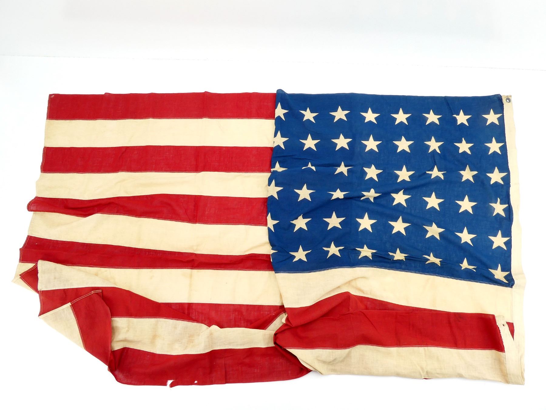 LOT INCLUDES; (1) RED / WHITE / BLUE ROUGH COTTON FLAG WITH 48-STARS, ONE METAL GROMMET (MISSING ONE), OFFICIAL FLAG FROM 1912 TO 1959, FAINT / UN-CLEAR INK STAMP ON HOIST SIDE OF FLAG, EACH RED & WHITE STRIPE SEWN TOGETHER, PRINTED STARS ON BLUE BACKGROUND, SHOWS AGE / WEAR / TEAR, APPROX. 96" X 55.5" & (5) PAMPHLETS ABOUT THE U.S. FLAG, HOW TO DISPLAY / RESPECT THE FLAG. SEE PHOTOS.