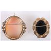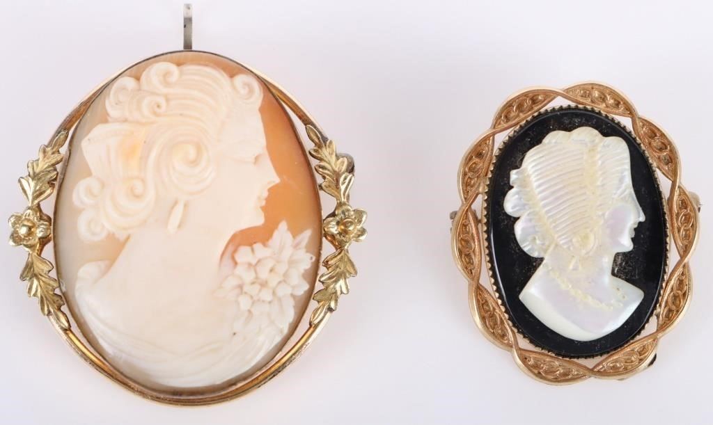 Vintage Van Dell and Catamore cameo ladies brooches to include one Van Dell 1/20 gold filled white cameo brooch and one Catamore black onyx and mother of pearl cameo brooch.