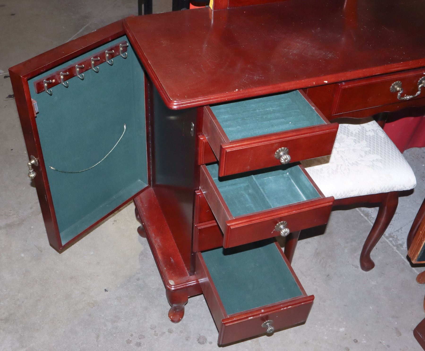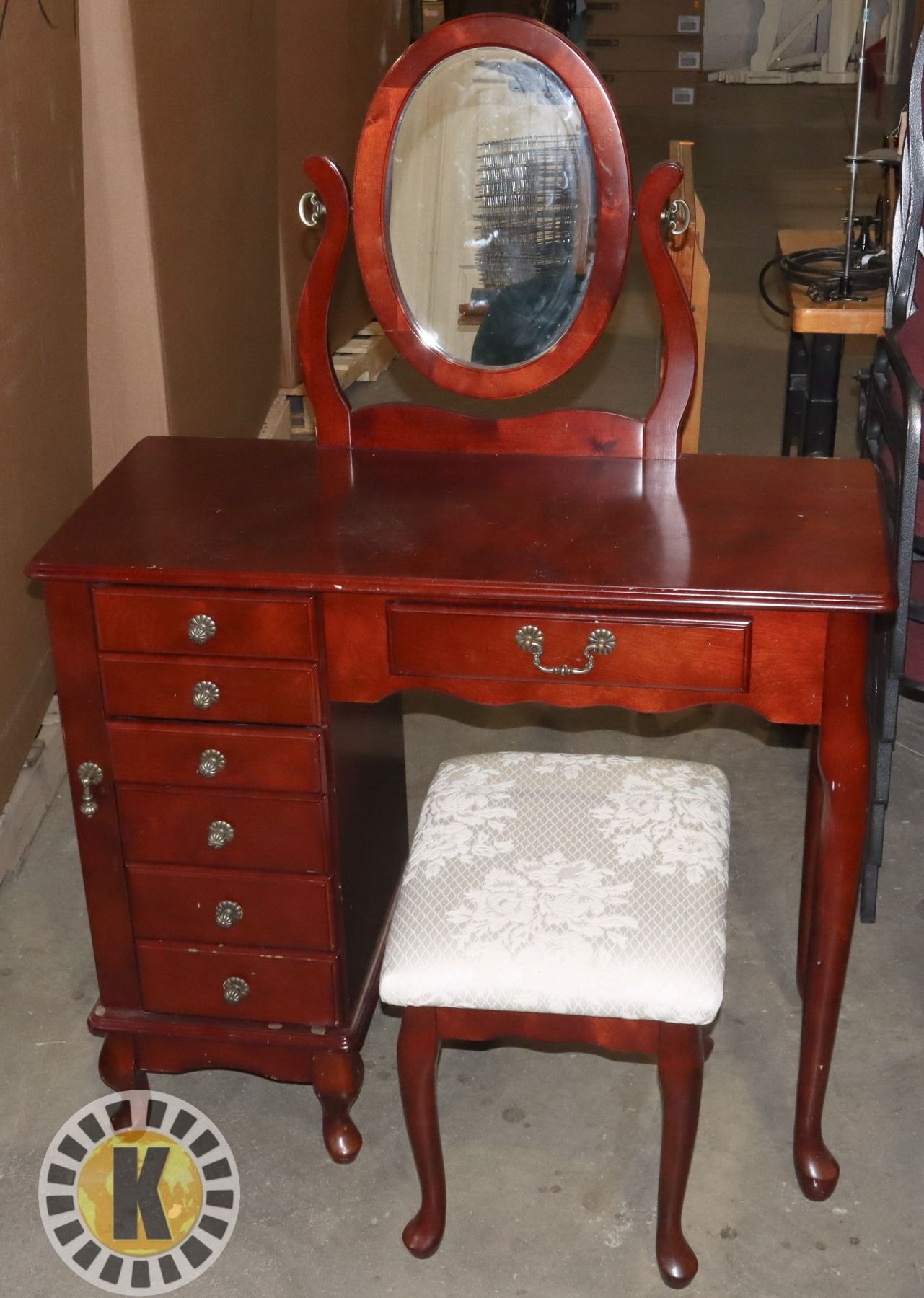 SOME DRAWERS TO LEFT SIDE SET UP TO HOLD JEWELRY. APPROX 36" WIDE X 16" DEEP X 31" TALL NOT INCLUDING MIRROR HEIGHT. INCLUDES MATCHING SEATING STOOL***ITEM(S) LOCATED IN LETHBRIDGE ALBERTA. SMALL ITEMS ONLY ARE AVAILABLE FOR FREE TRANSPORT TO EDMONTON OFFICE (READ AUCTION DETAILS FOR MORE INFORMATION)
