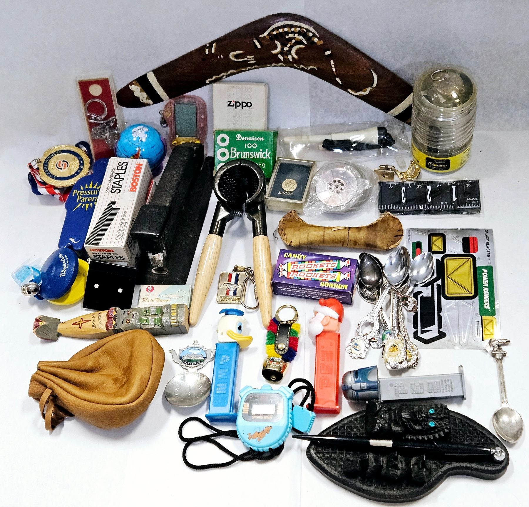 BOOMERANG-SILVER SPOONS-LEATHER POUCH-LOTS OF TREASURES